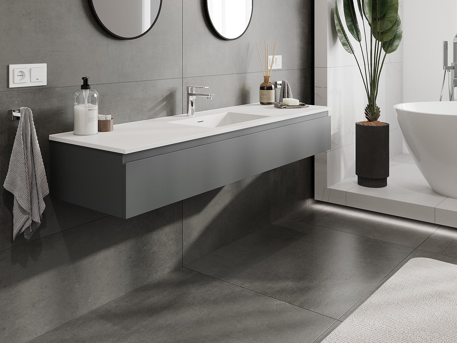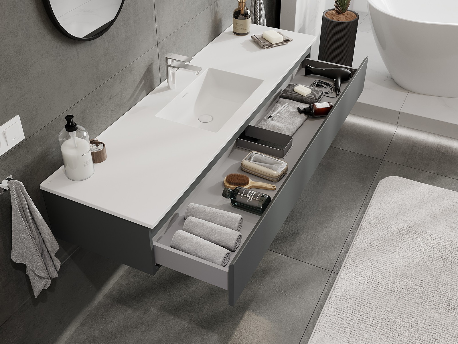 Mobilierul nostru modular pentru baie poate fi combinat în diverse configurații de culori, permițând personalizarea completă. Puteți alege atât aspectul, cât și funcțiile fiecărui element, ceea ce permite adaptarea mobilierului la preferințele dvs. stilistice și funcționale.