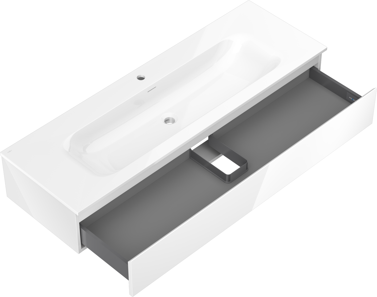 Decupajul în sertar este proiectat în așa fel încât să acomodeze sifonul, care este esențial în instalațiile de lavoare. Datorită acestui fapt, mobila poate fi montată complet funcțională, fără a fi necesară renunțarea la spațiul din sertar în favoarea instalației.