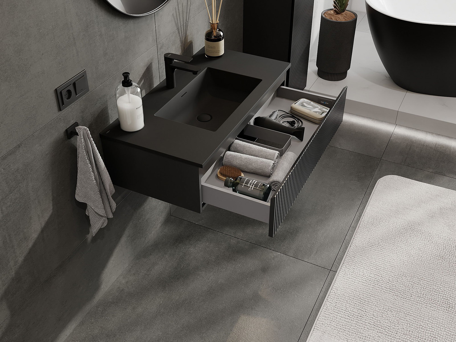 Mexen Rivel dulap de baie 90 cm cu lavoar Otis, 1 sertar, riflat, negru mat - 91A20-09023-1-BF71-W18M71