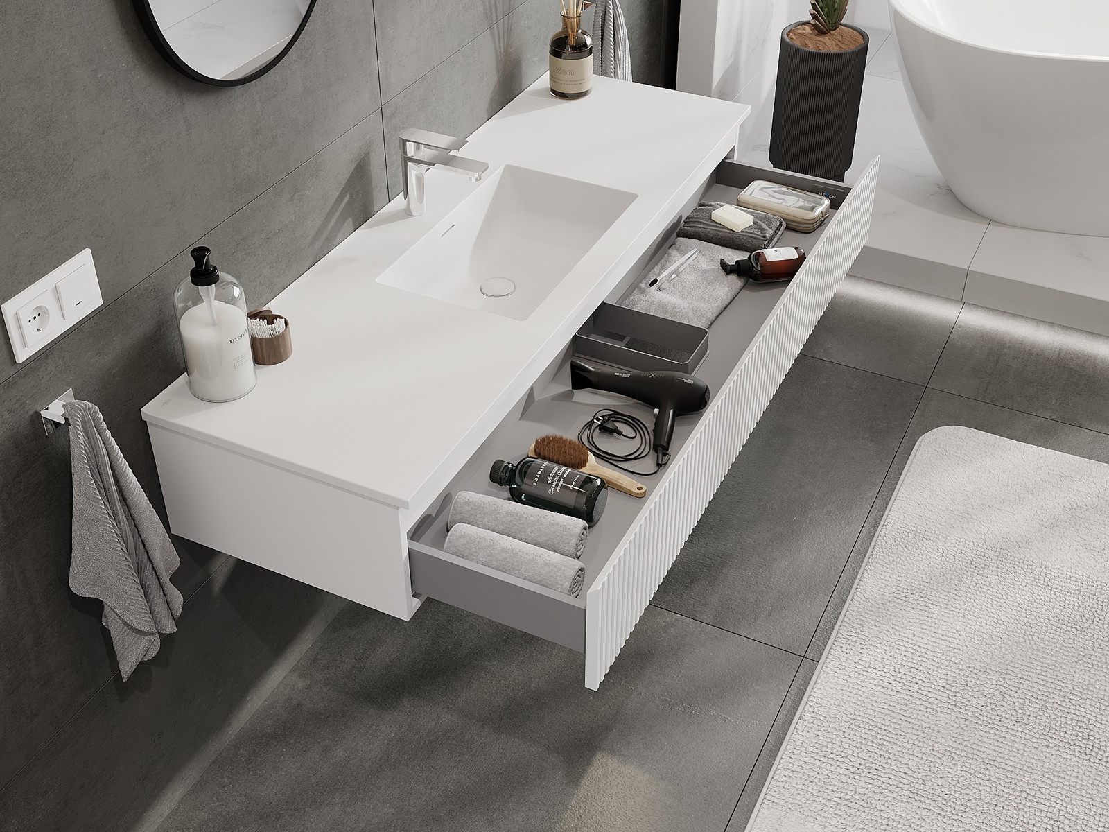 Mobilierul nostru modular pentru baie poate fi combinat în diverse configurații de culori, permițând personalizarea completă. Puteți alege atât aspectul, cât și funcțiile fiecărui element, ceea ce permite adaptarea mobilierului la preferințele dvs. stilistice și funcționale.