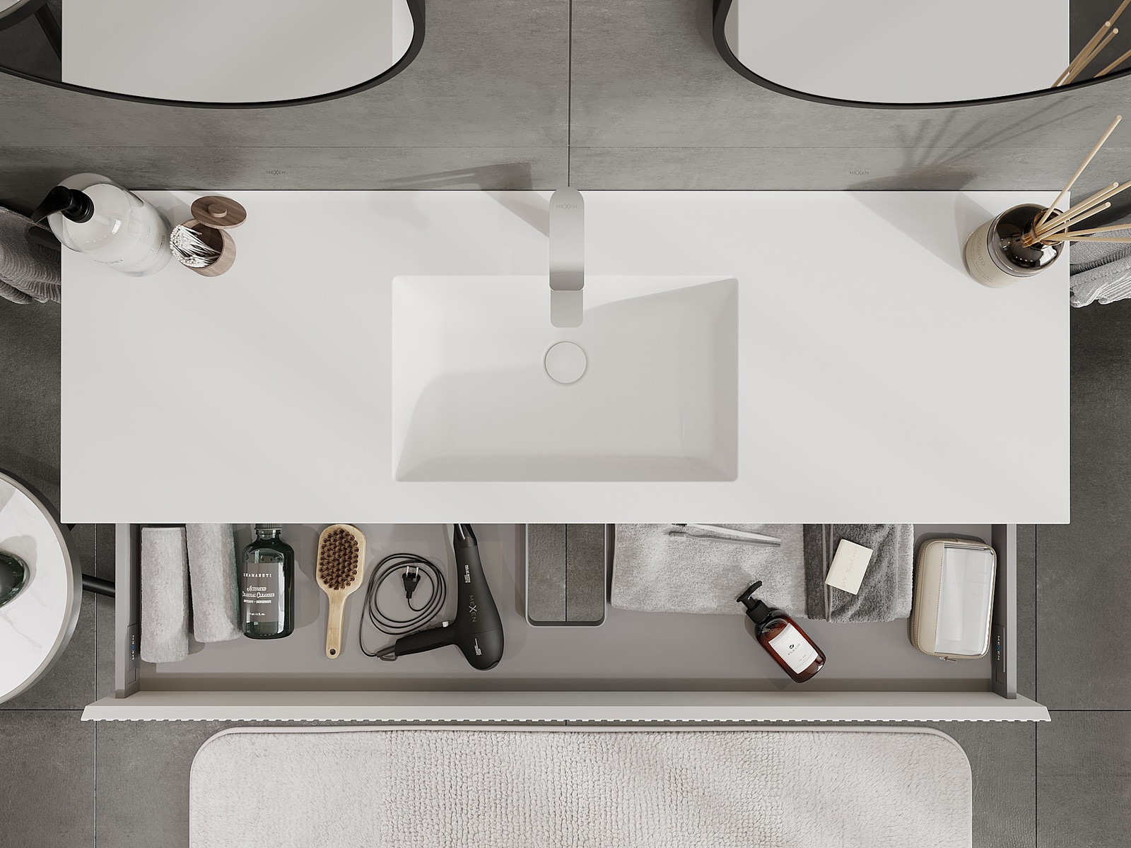 Decupajul în sertar este proiectat în așa fel încât să acomodeze sifonul, care este esențial în instalațiile de lavoare. Datorită acestui fapt, mobila poate fi montată complet funcțională, fără a fi necesară renunțarea la spațiul din sertar în favoarea instalației.