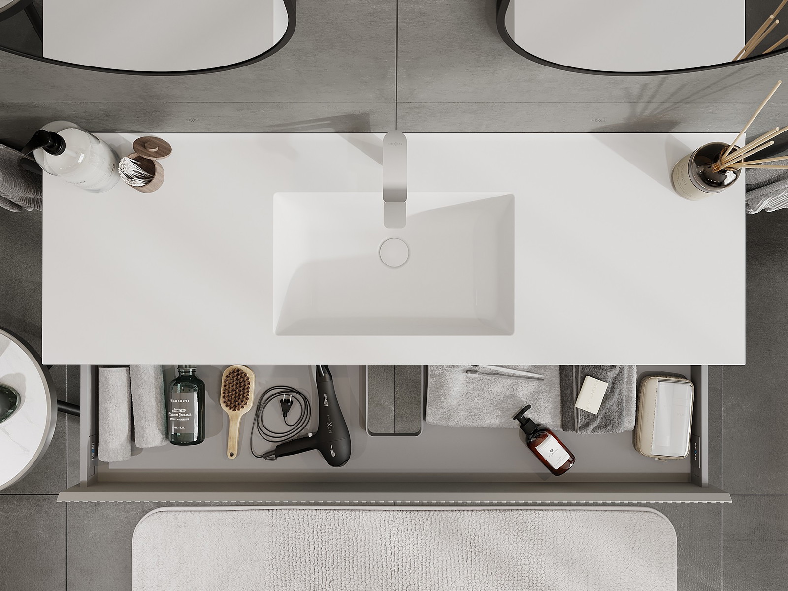 Decupajul în sertar este proiectat în așa fel încât să acomodeze sifonul, care este esențial în instalațiile de lavoare. Datorită acestui fapt, mobila poate fi montată complet funcțională, fără a fi necesară renunțarea la spațiul din sertar în favoarea instalației.