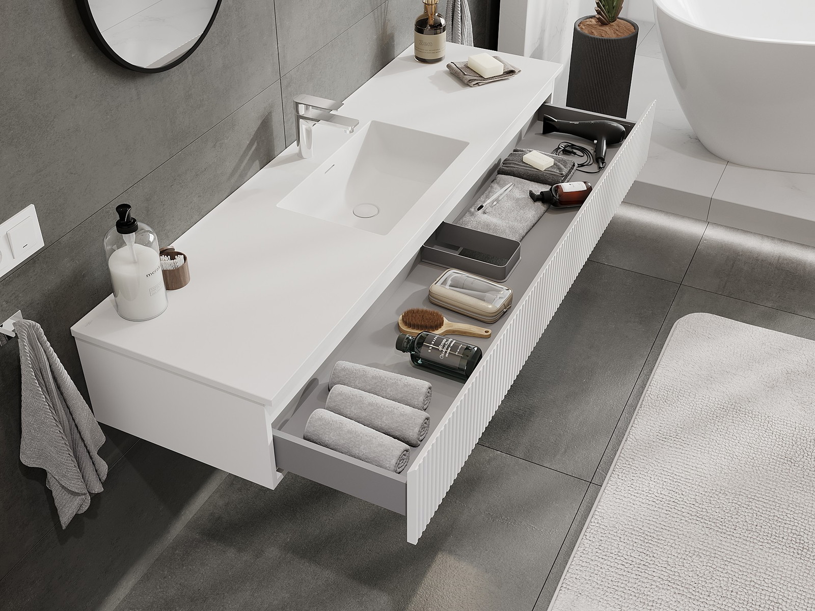 Mobilierul nostru modular pentru baie poate fi combinat în diverse configurații de culori, permițând personalizarea completă. Puteți alege atât aspectul, cât și funcțiile fiecărui element, ceea ce permite adaptarea mobilierului la preferințele dvs. stilistice și funcționale.