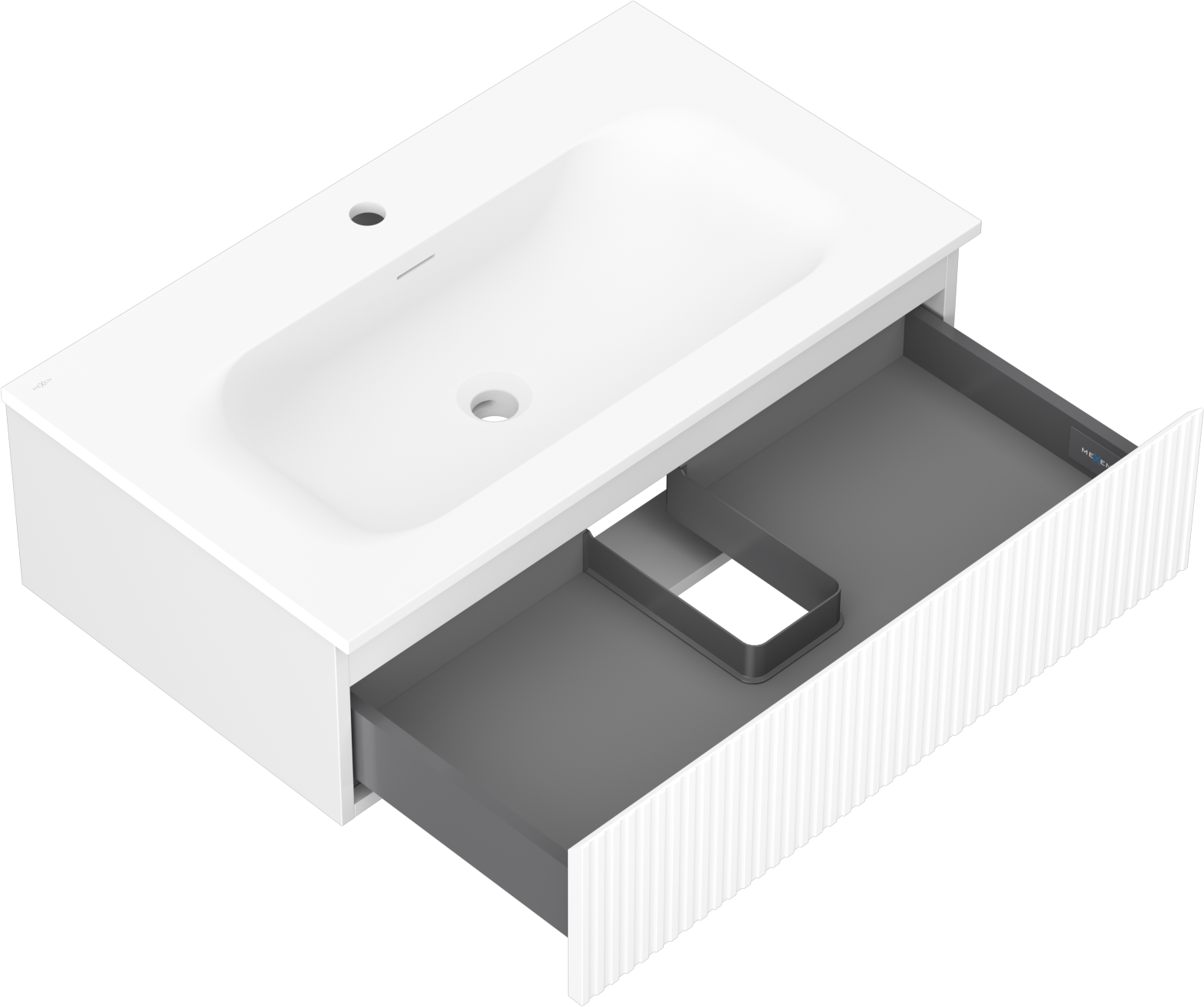 Decupajul în sertar este proiectat în așa fel încât să acomodeze sifonul, care este esențial în instalațiile de lavoare. Datorită acestui fapt, mobila poate fi montată complet funcțională, fără a fi necesară renunțarea la spațiul din sertar în favoarea instalației.