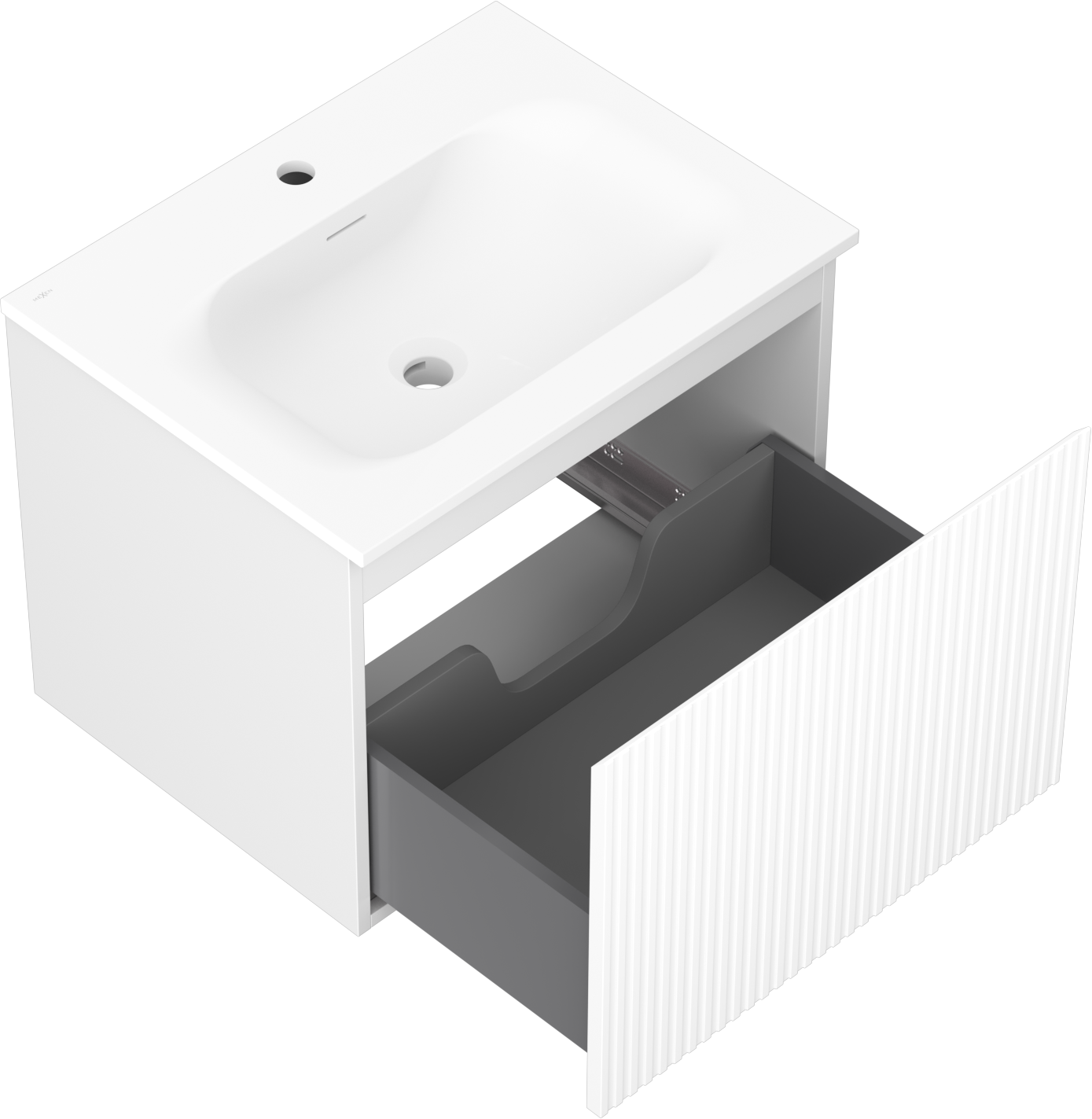 Decupajul în sertar este proiectat în așa fel încât să acomodeze sifonul, care este esențial în instalațiile de lavoare. Datorită acestui fapt, mobila poate fi montată complet funcțională, fără a fi necesară renunțarea la spațiul din sertar în favoarea instalației.