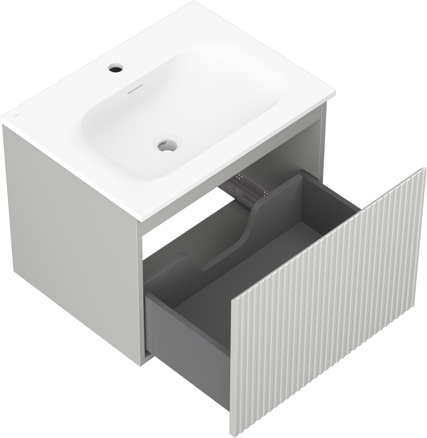 Decupajul în sertar este proiectat în așa fel încât să acomodeze sifonul, care este esențial în instalațiile de lavoare. Datorită acestui fapt, mobila poate fi montată complet funcțională, fără a fi necesară renunțarea la spațiul din sertar în favoarea instalației.