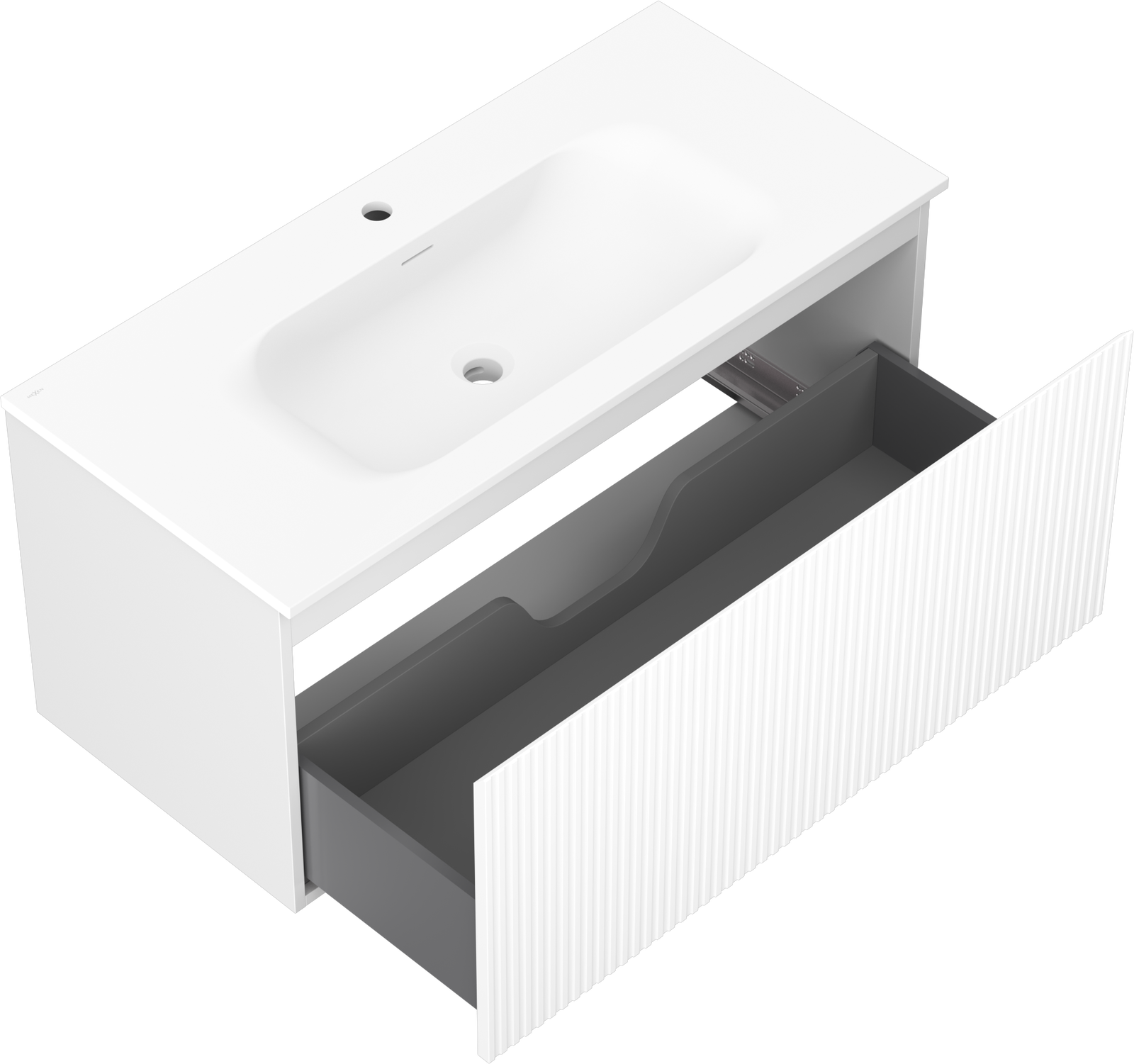 Decupajul în sertar este proiectat în așa fel încât să acomodeze sifonul, care este esențial în instalațiile de lavoare. Datorită acestui fapt, mobila poate fi montată complet funcțională, fără a fi necesară renunțarea la spațiul din sertar în favoarea instalației.