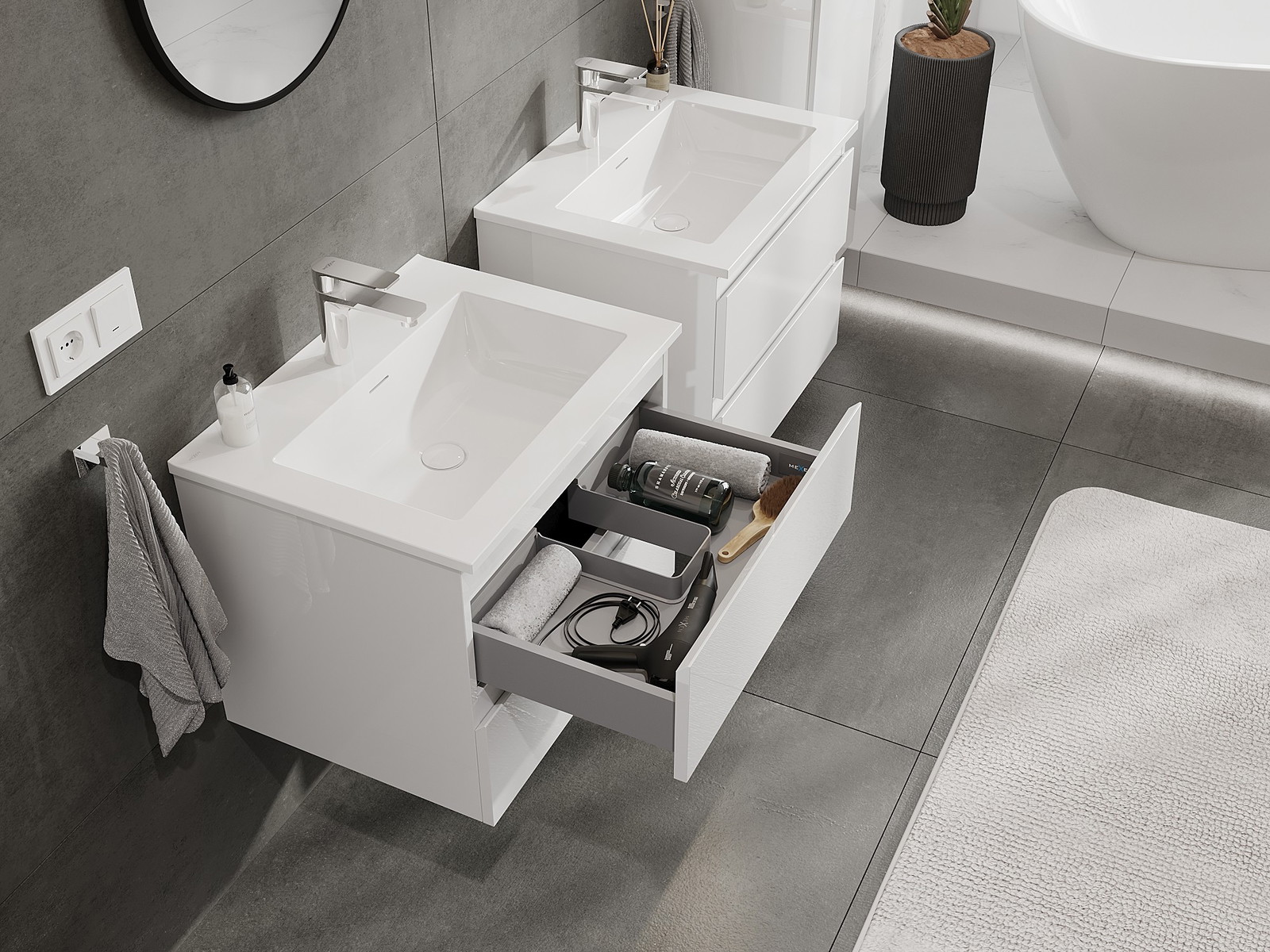 Mobilierul nostru modular pentru baie poate fi combinat în diverse configurații de culori, permițând personalizarea completă. Puteți alege atât aspectul, cât și funcțiile fiecărui element, ceea ce permite adaptarea mobilierului la preferințele dvs. stilistice și funcționale.