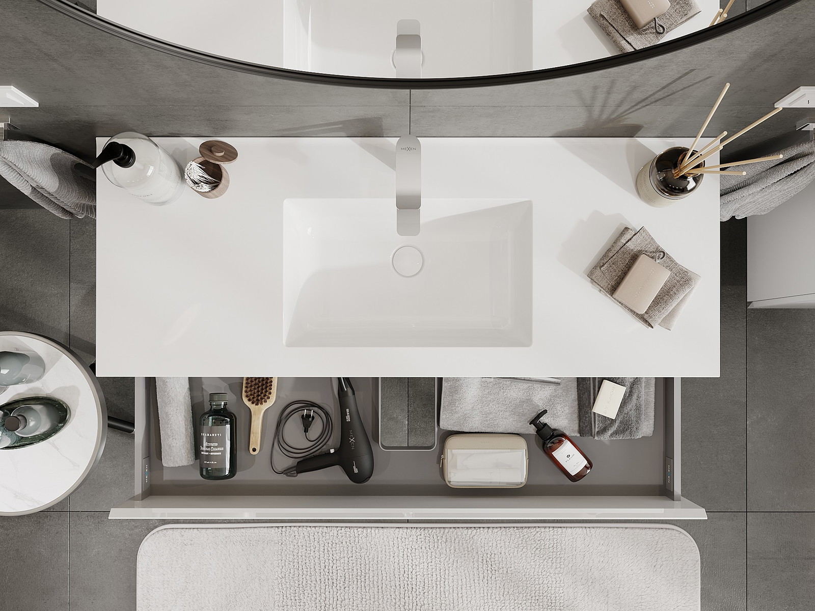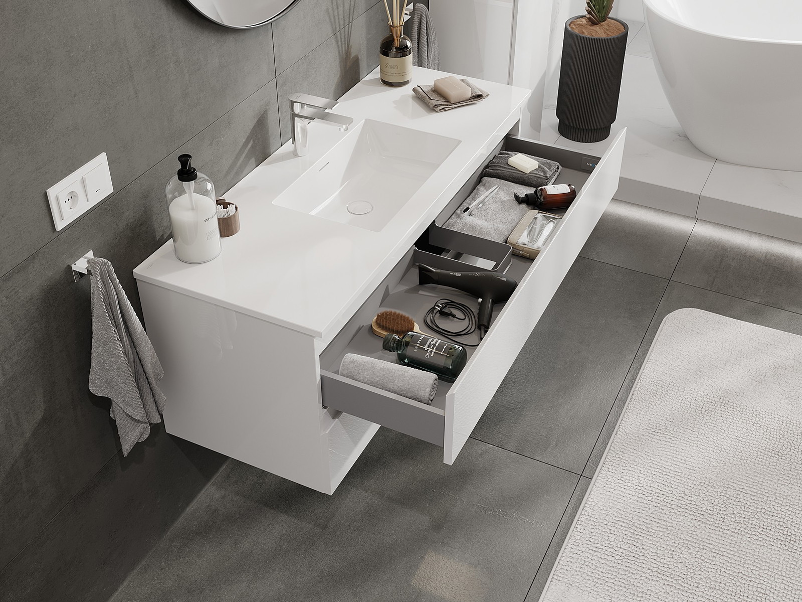 Mobilierul nostru modular pentru baie poate fi combinat în diverse configurații de culori, permițând personalizarea completă. Puteți alege atât aspectul, cât și funcțiile fiecărui element, ceea ce permite adaptarea mobilierului la preferințele dvs. stilistice și funcționale.