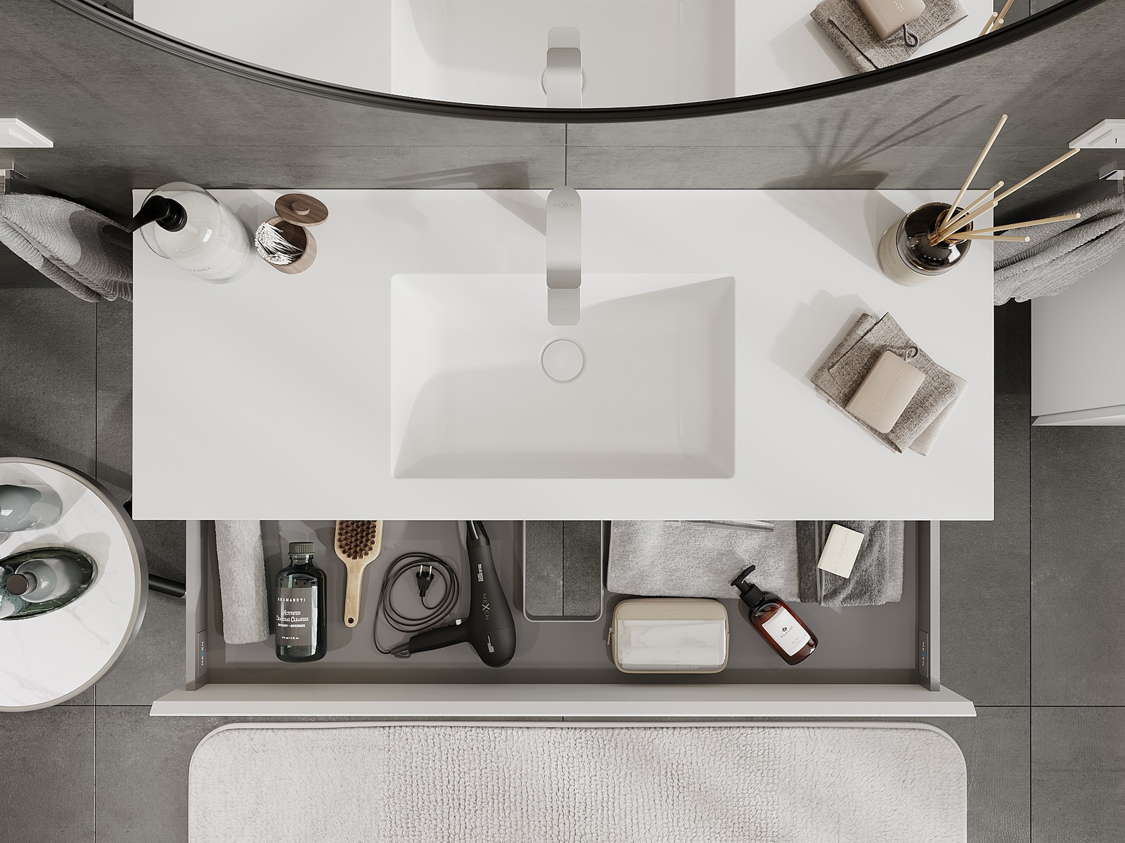 Decupajul în sertar este proiectat în așa fel încât să acomodeze sifonul, care este esențial în instalațiile de lavoare. Datorită acestui fapt, mobila poate fi montată complet funcțională, fără a fi necesară renunțarea la spațiul din sertar în favoarea instalației.