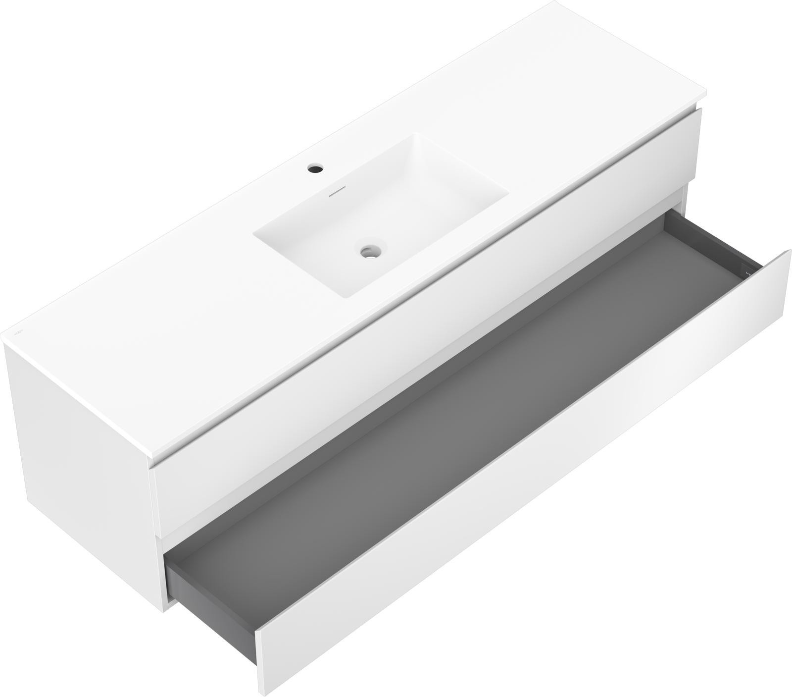 Decupajul în sertar este proiectat în așa fel încât să acomodeze sifonul, care este esențial în instalațiile de lavoare. Datorită acestui fapt, mobila poate fi montată complet funcțională, fără a fi necesară renunțarea la spațiul din sertar în favoarea instalației.