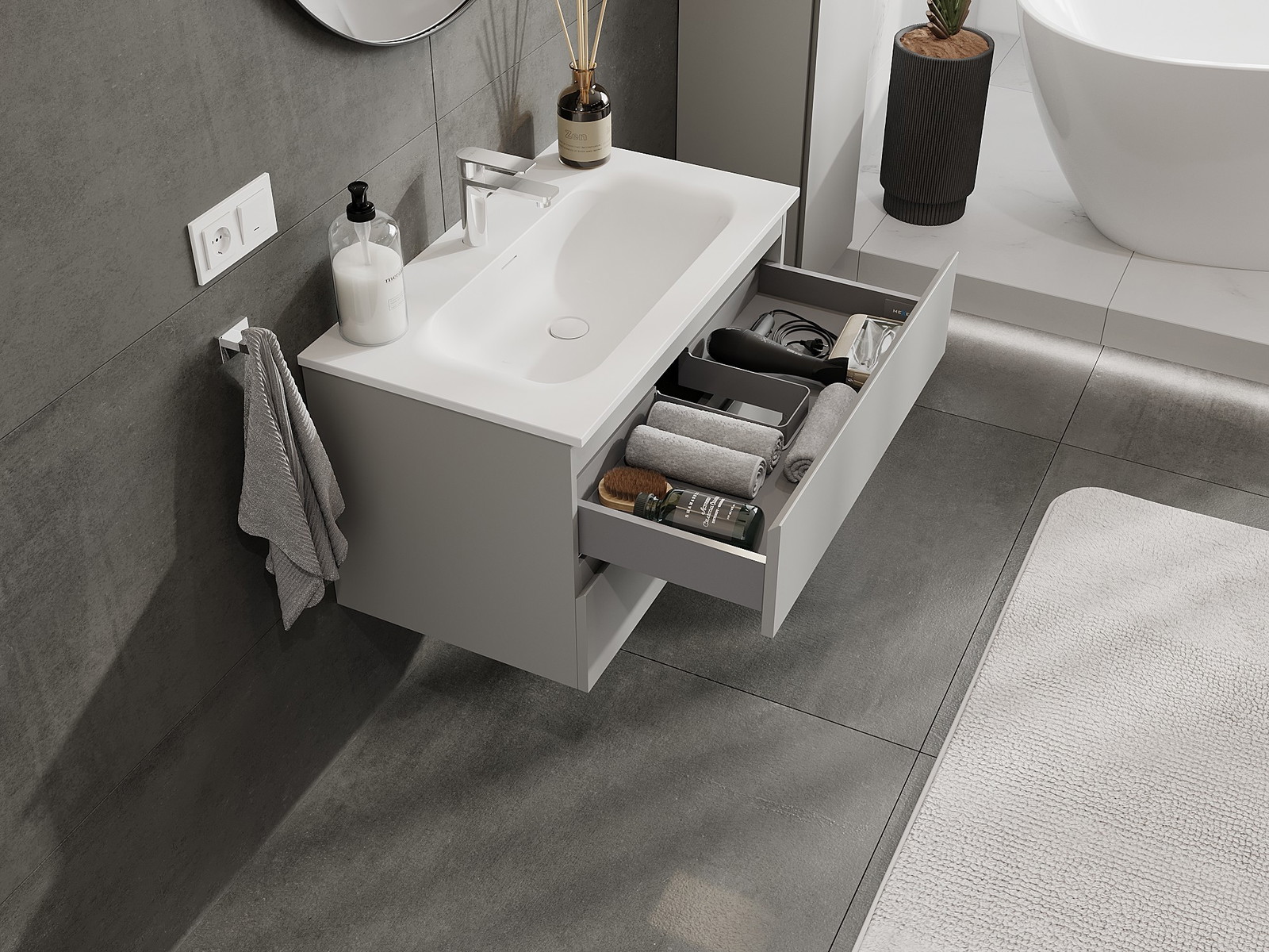 Mobilierul nostru modular pentru baie poate fi combinat în diverse configurații de culori, permițând personalizarea completă. Puteți alege atât aspectul, cât și funcțiile fiecărui element, ceea ce permite adaptarea mobilierului la preferințele dvs. stilistice și funcționale.