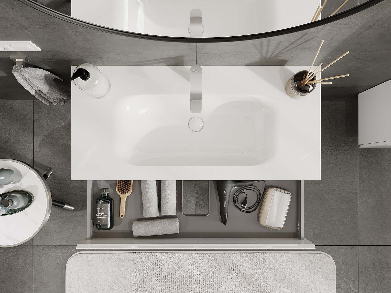 Decupajul în sertar este proiectat în așa fel încât să acomodeze sifonul, care este esențial în instalațiile de lavoare. Datorită acestui fapt, mobila poate fi montată complet funcțională, fără a fi necesară renunțarea la spațiul din sertar în favoarea instalației.