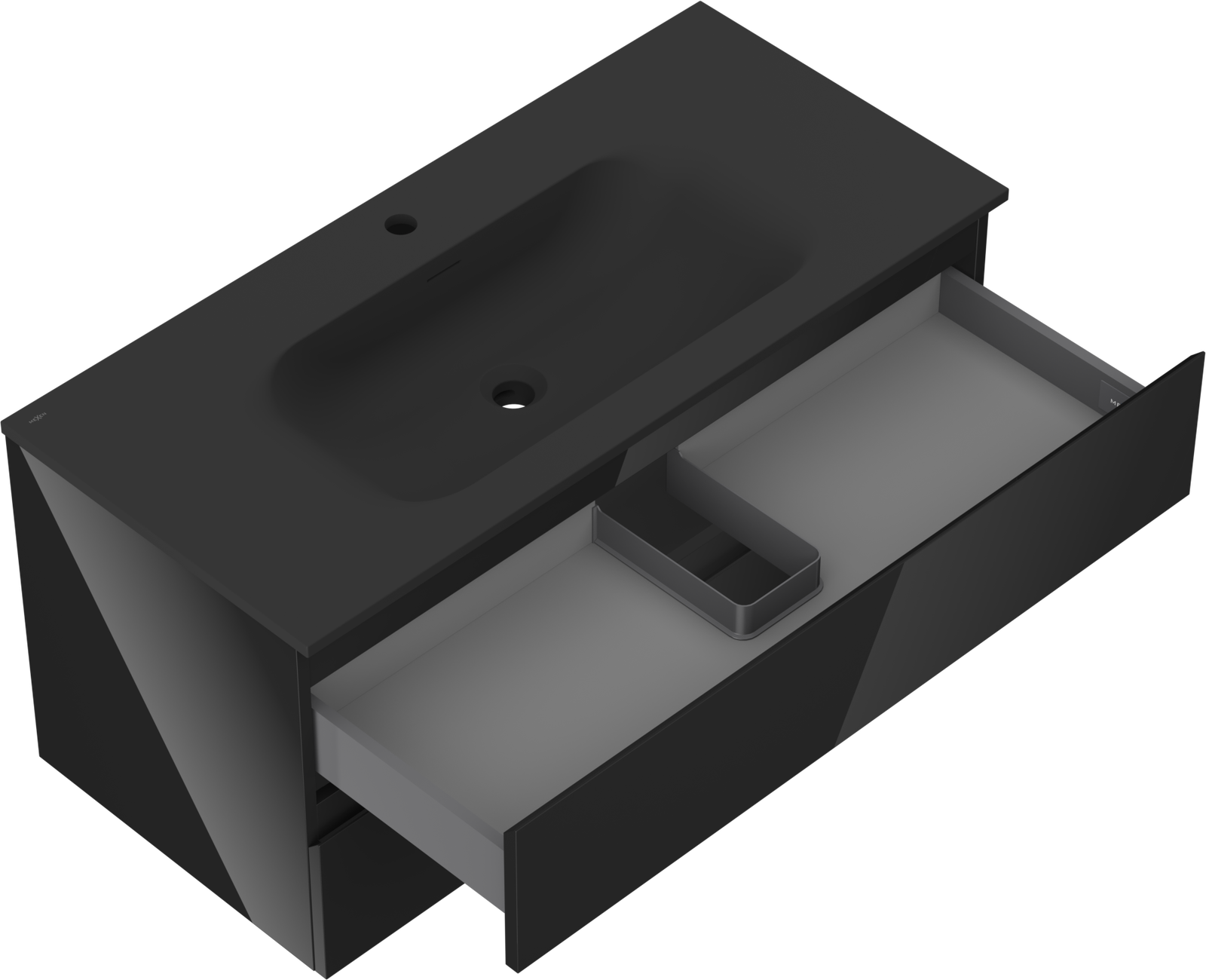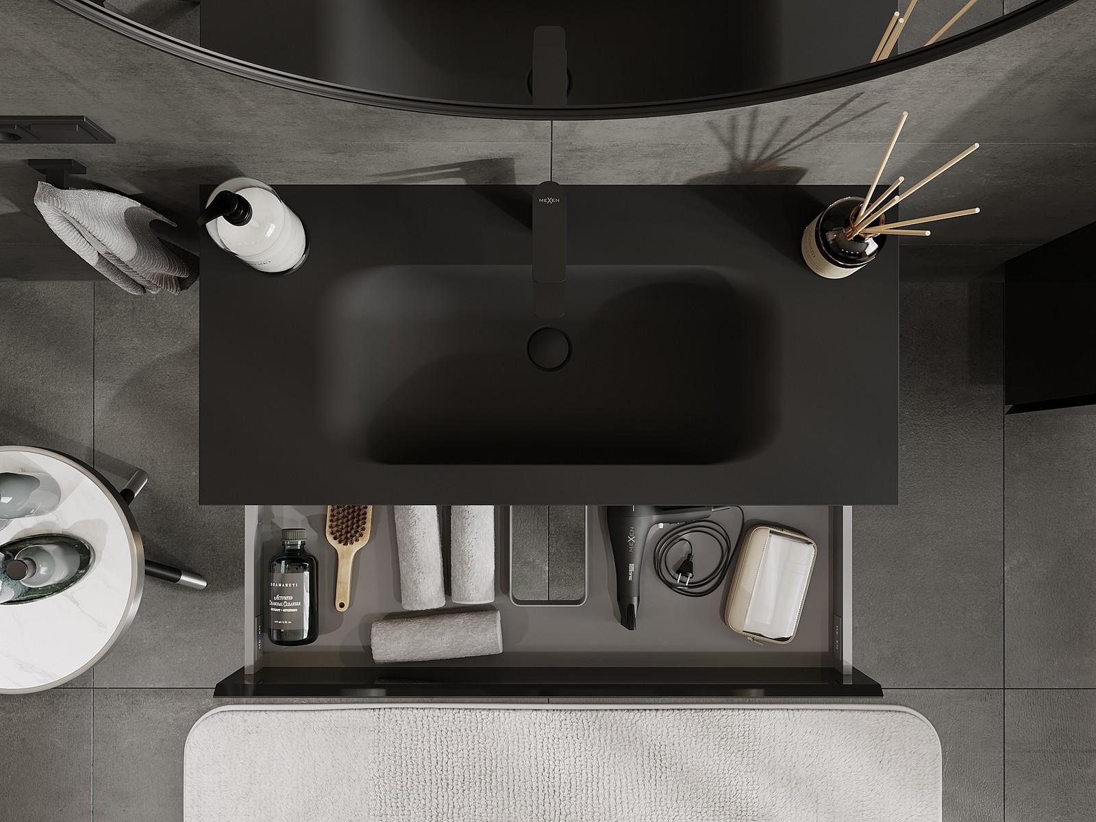Decupajul în sertar este proiectat în așa fel încât să acomodeze sifonul, care este esențial în instalațiile de lavoare. Datorită acestui fapt, mobila poate fi montată complet funcțională, fără a fi necesară renunțarea la spațiul din sertar în favoarea instalației.