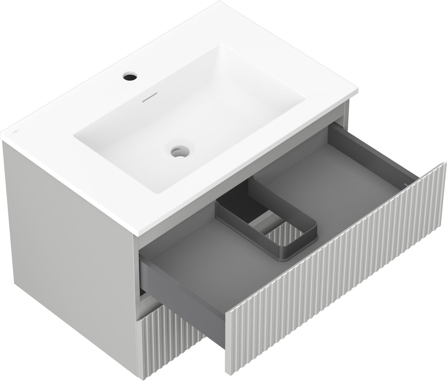 Decupajul în sertar este proiectat în așa fel încât să acomodeze sifonul, care este esențial în instalațiile de lavoare. Datorită acestui fapt, mobila poate fi montată complet funcțională, fără a fi necesară renunțarea la spațiul din sertar în favoarea instalației.