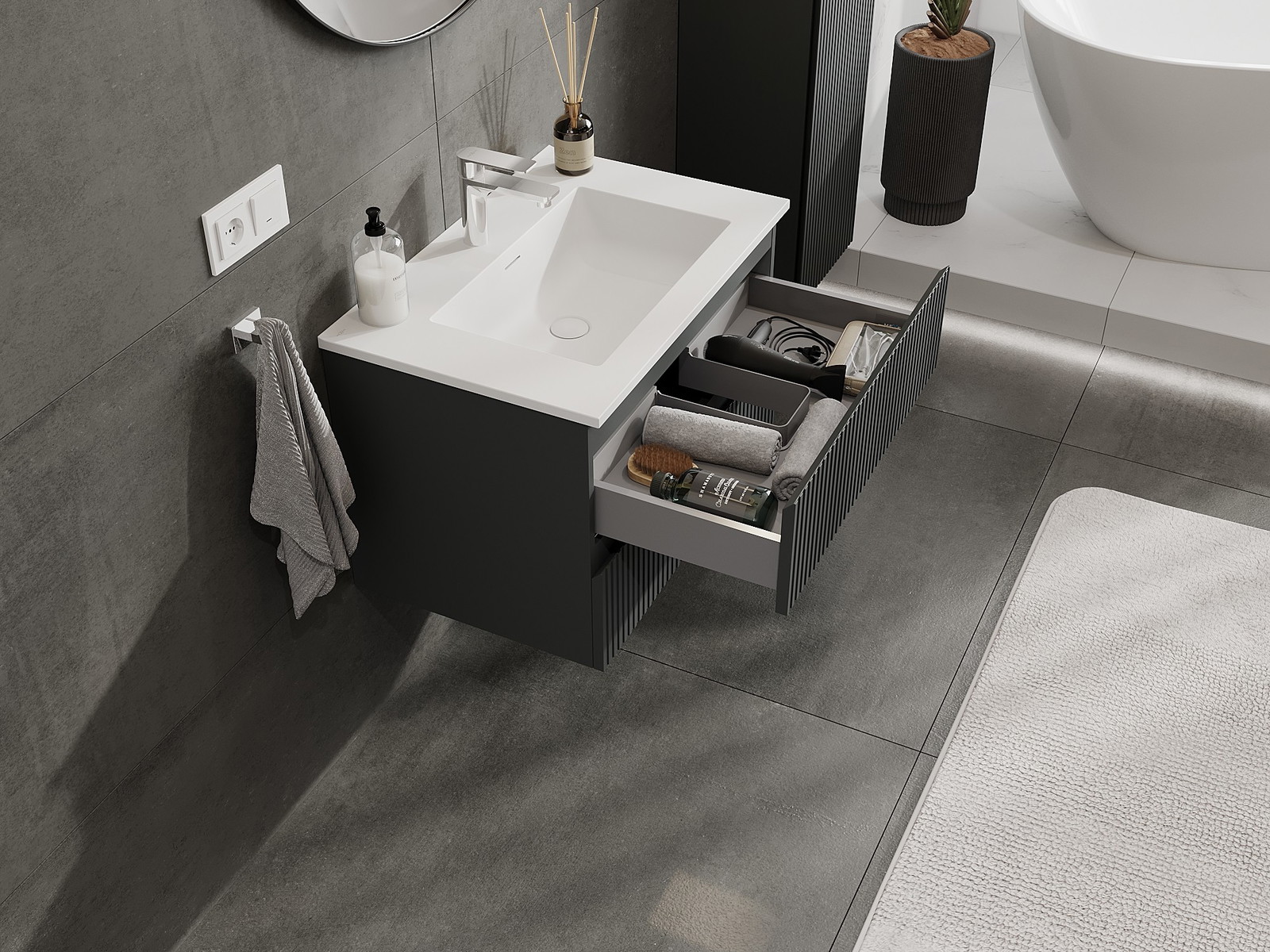 Mobilierul nostru modular pentru baie poate fi combinat în diverse configurații de culori, permițând personalizarea completă. Puteți alege atât aspectul, cât și funcțiile fiecărui element, ceea ce permite adaptarea mobilierului la preferințele dvs. stilistice și funcționale.