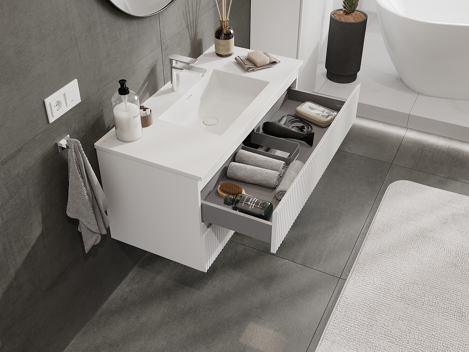 Mobilierul nostru modular pentru baie poate fi combinat în diverse configurații de culori, permițând personalizarea completă. Puteți alege atât aspectul, cât și funcțiile fiecărui element, ceea ce permite adaptarea mobilierului la preferințele dvs. stilistice și funcționale.