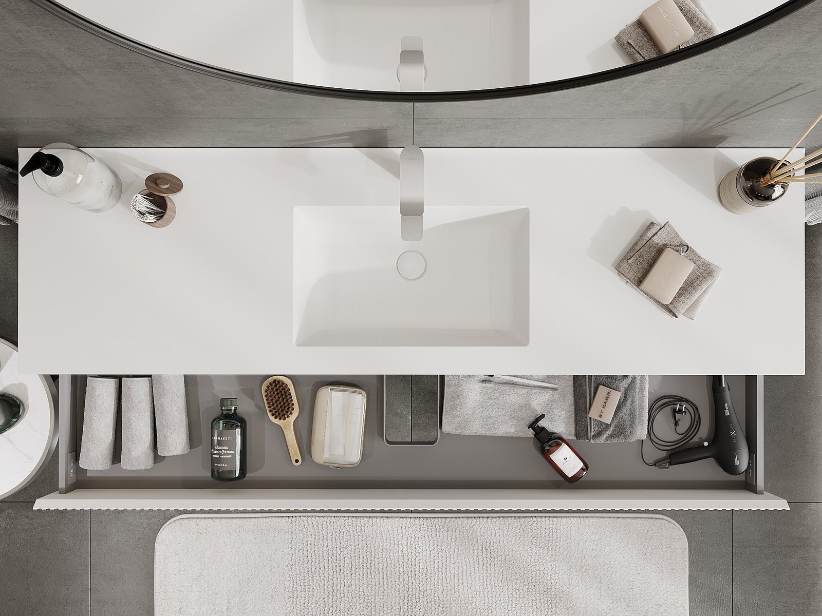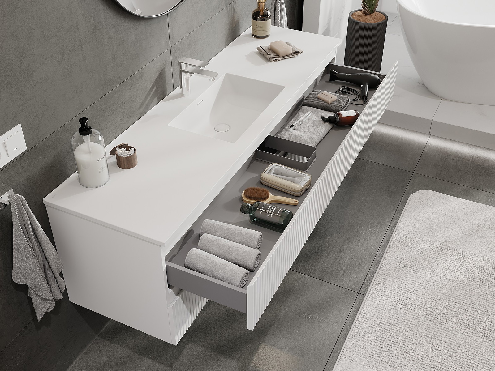 Mobilierul nostru modular pentru baie poate fi combinat în diverse configurații de culori, permițând personalizarea completă. Puteți alege atât aspectul, cât și funcțiile fiecărui element, ceea ce permite adaptarea mobilierului la preferințele dvs. stilistice și funcționale.