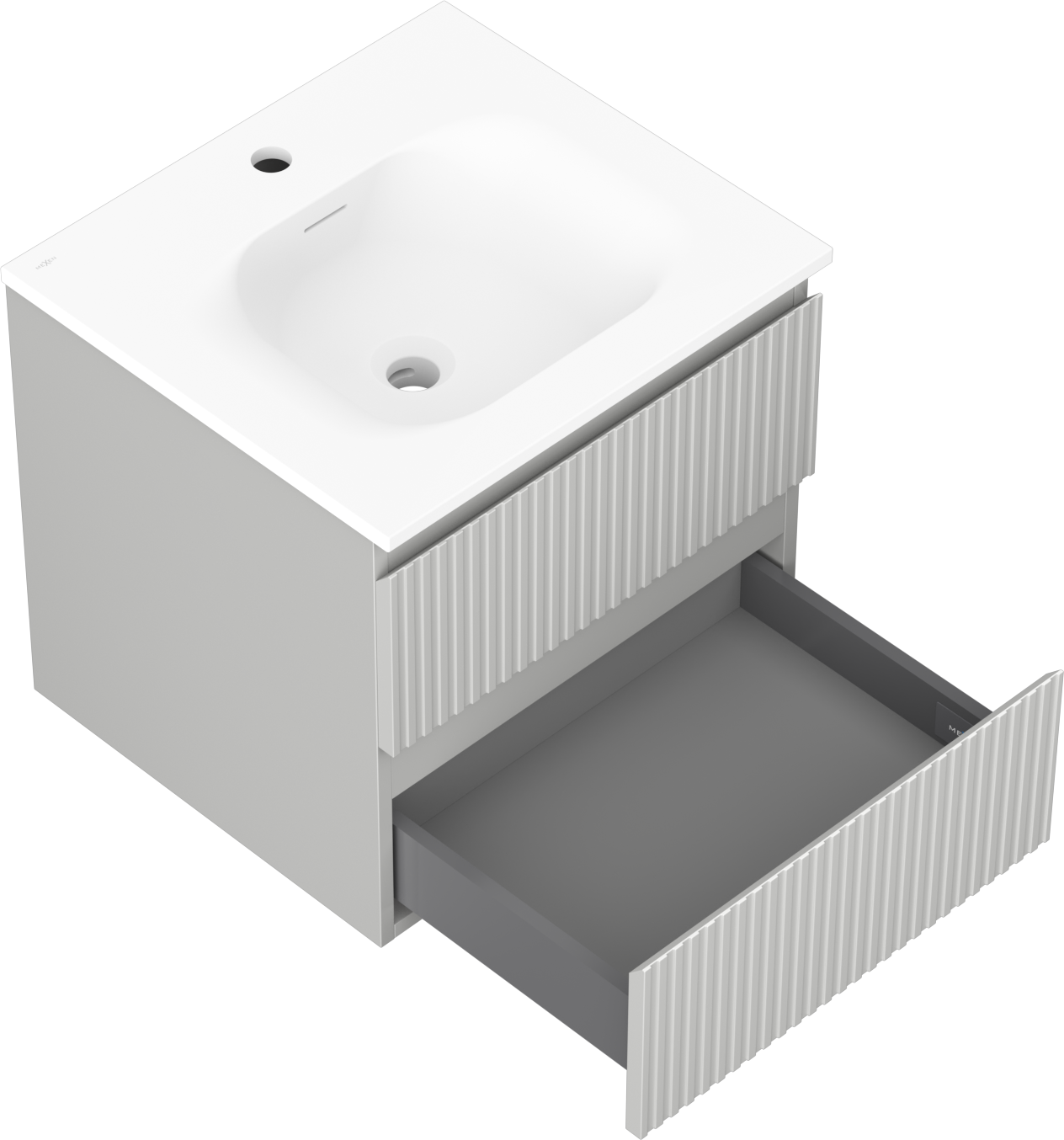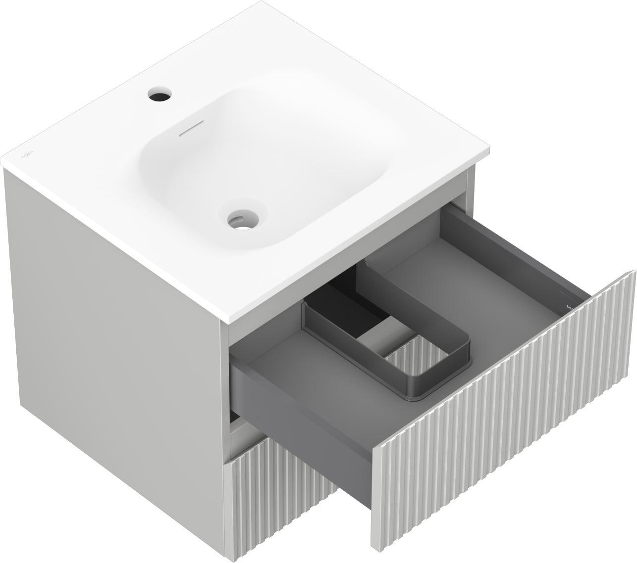 Decupajul în sertar este proiectat în așa fel încât să acomodeze sifonul, care este esențial în instalațiile de lavoare. Datorită acestui fapt, mobila poate fi montată complet funcțională, fără a fi necesară renunțarea la spațiul din sertar în favoarea instalației.
