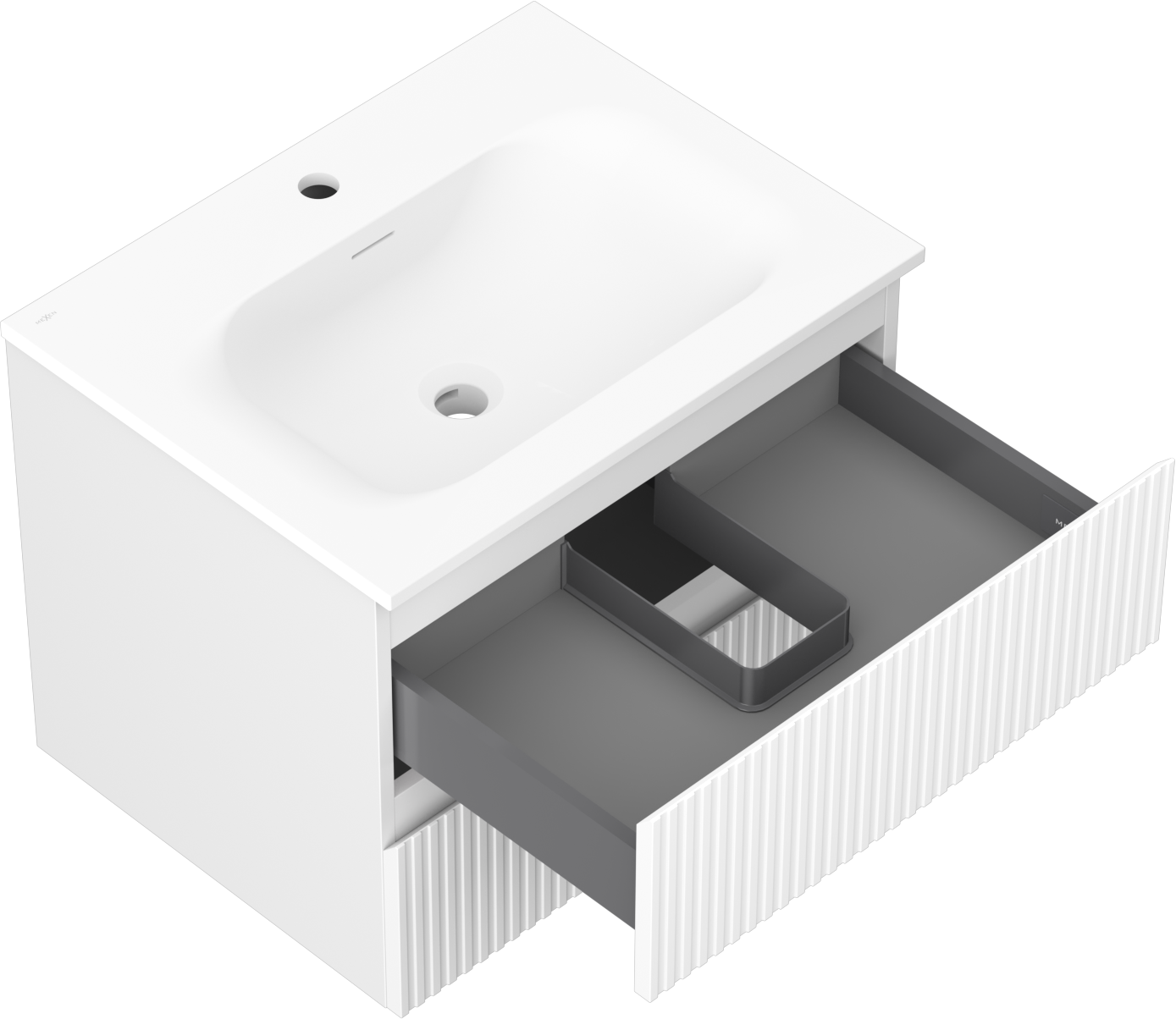 Decupajul în sertar este proiectat în așa fel încât să acomodeze sifonul, care este esențial în instalațiile de lavoare. Datorită acestui fapt, mobila poate fi montată complet funcțională, fără a fi necesară renunțarea la spațiul din sertar în favoarea instalației.