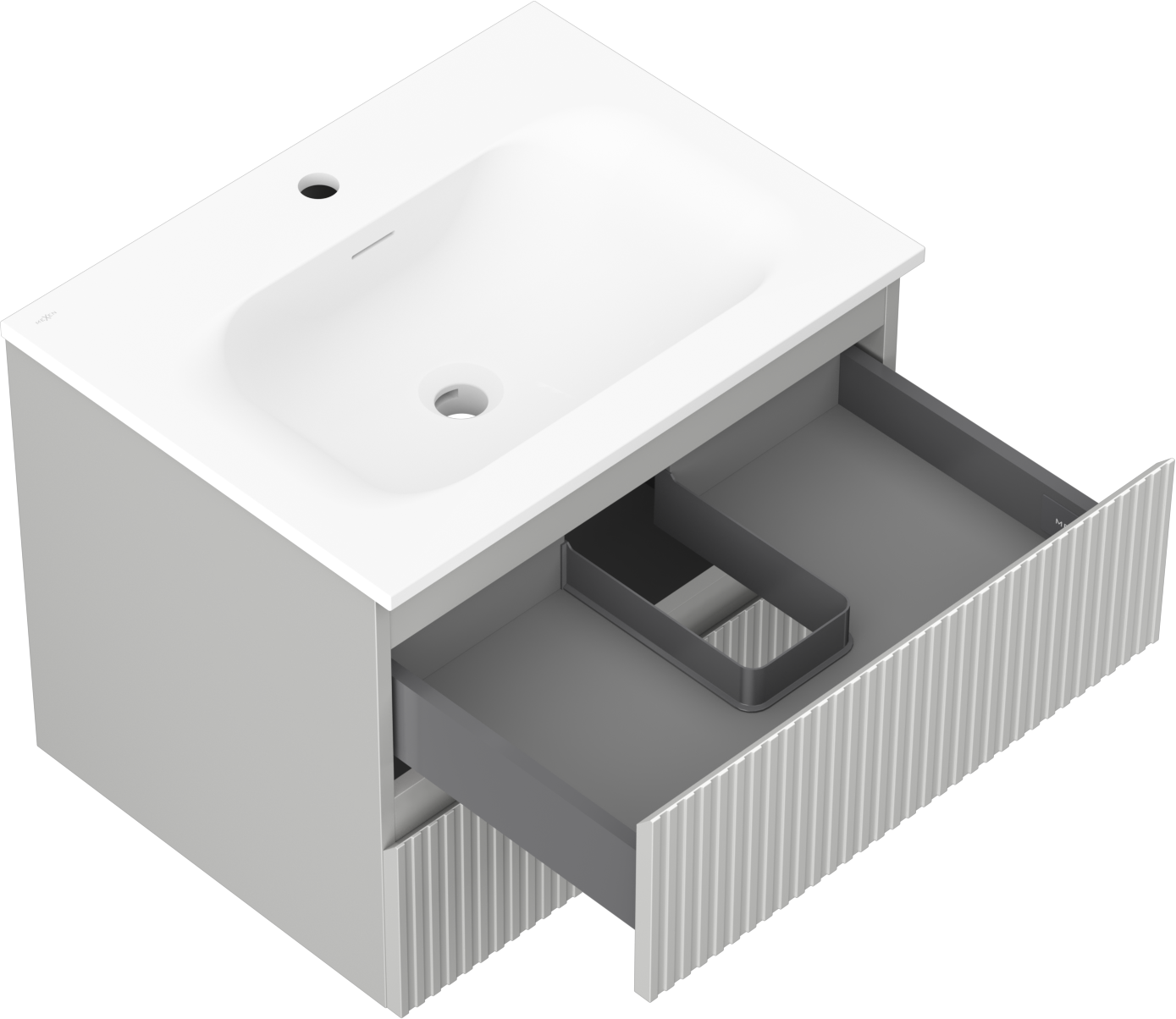 Decupajul în sertar este proiectat în așa fel încât să acomodeze sifonul, care este esențial în instalațiile de lavoare. Datorită acestui fapt, mobila poate fi montată complet funcțională, fără a fi necesară renunțarea la spațiul din sertar în favoarea instalației.
