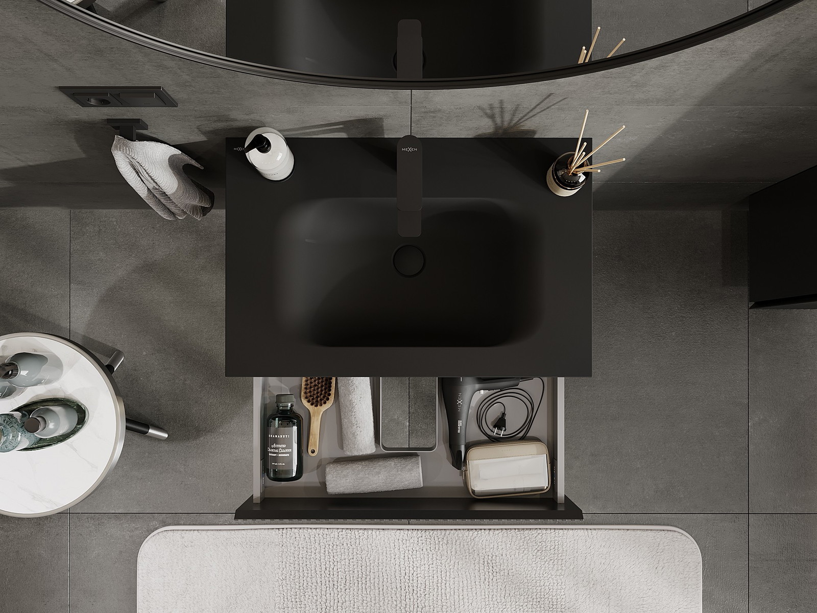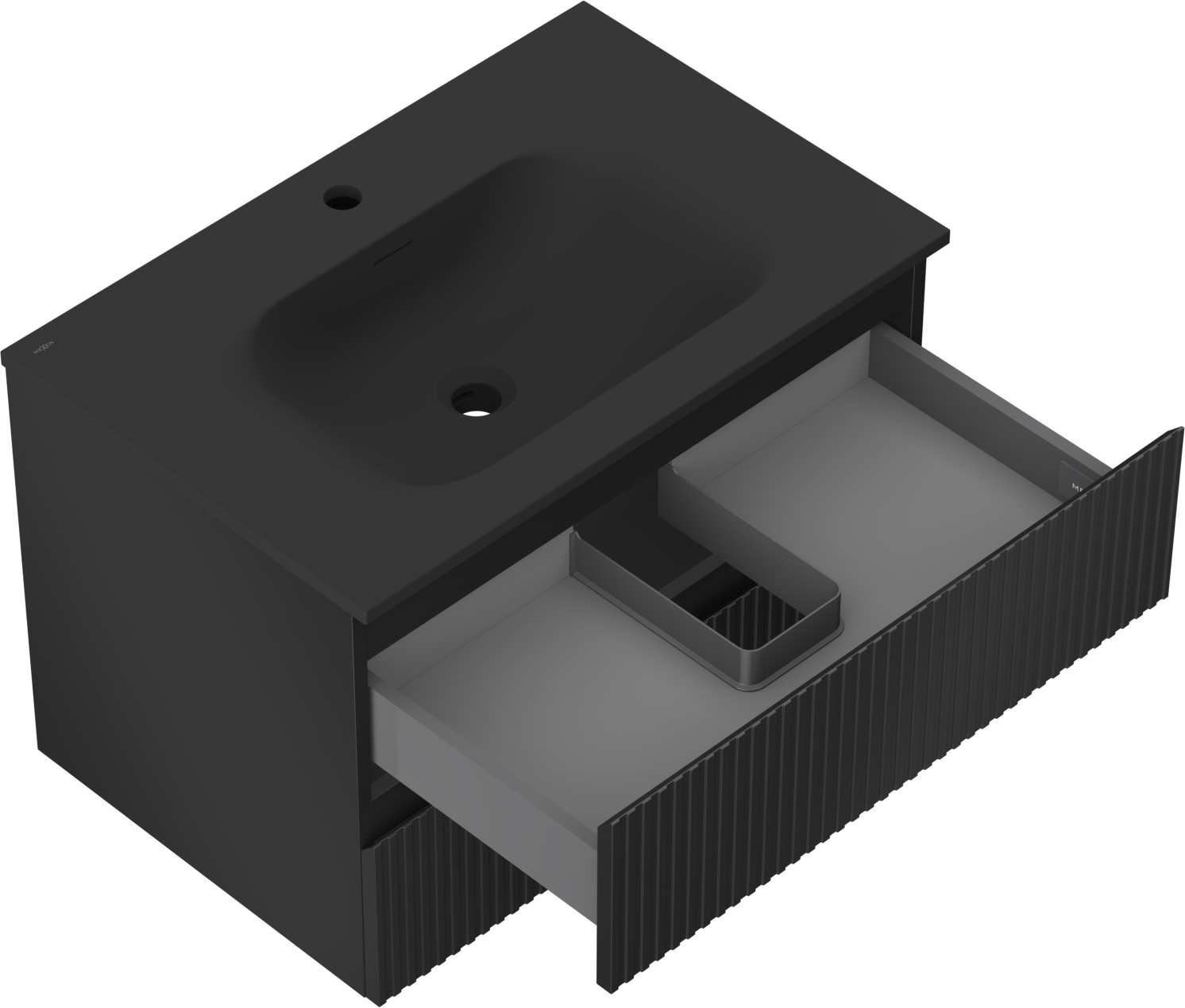 Decupajul în sertar este proiectat în așa fel încât să acomodeze sifonul, care este esențial în instalațiile de lavoare. Datorită acestui fapt, mobila poate fi montată complet funcțională, fără a fi necesară renunțarea la spațiul din sertar în favoarea instalației.