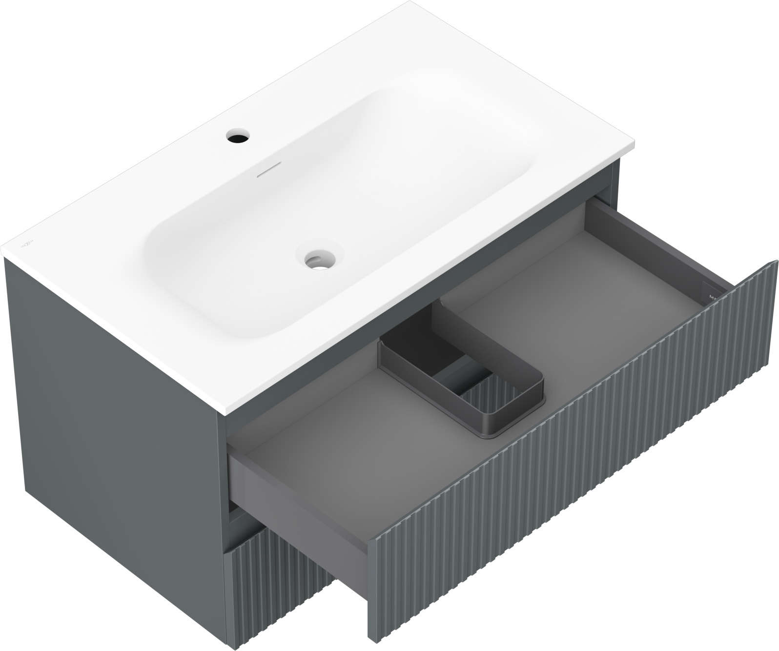 Decupajul în sertar este proiectat în așa fel încât să acomodeze sifonul, care este esențial în instalațiile de lavoare. Datorită acestui fapt, mobila poate fi montată complet funcțională, fără a fi necesară renunțarea la spațiul din sertar în favoarea instalației.