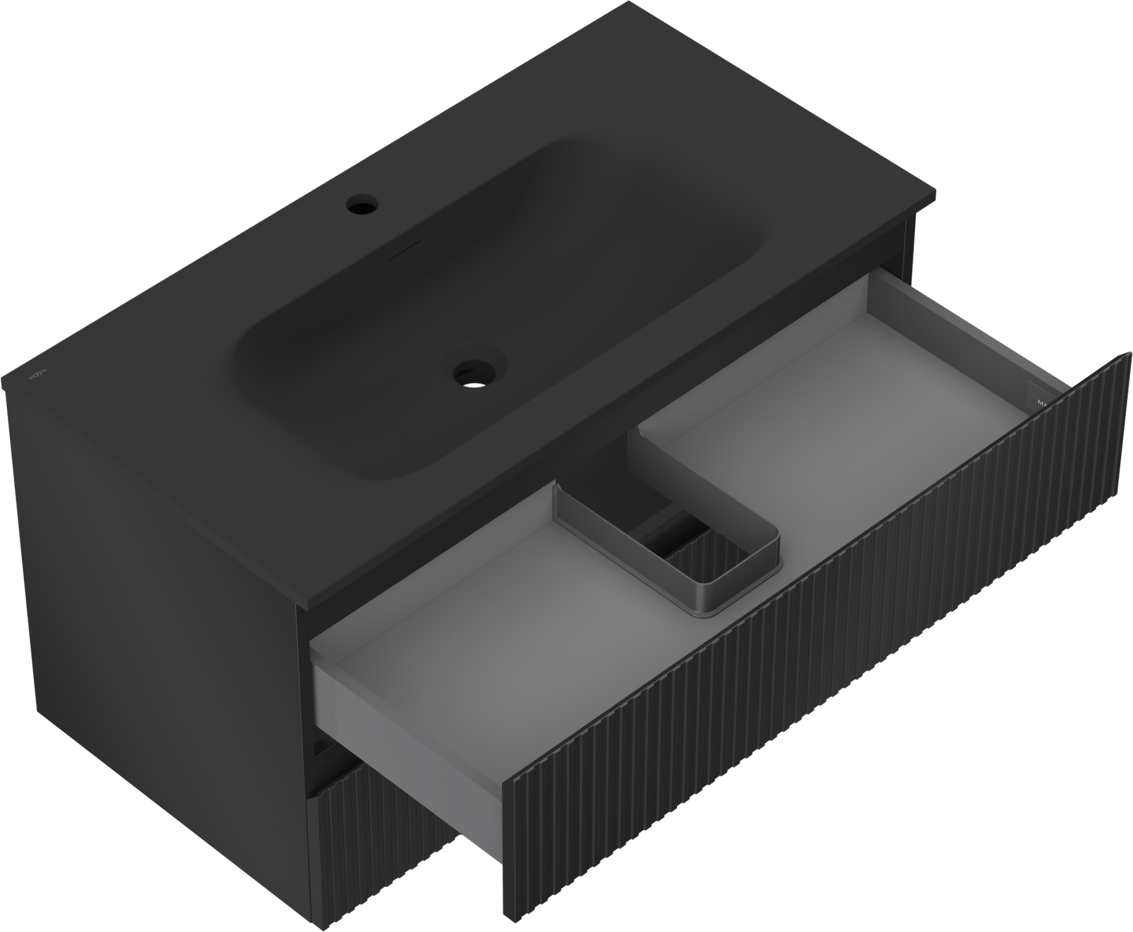 Decupajul în sertar este proiectat în așa fel încât să acomodeze sifonul, care este esențial în instalațiile de lavoare. Datorită acestui fapt, mobila poate fi montată complet funcțională, fără a fi necesară renunțarea la spațiul din sertar în favoarea instalației.