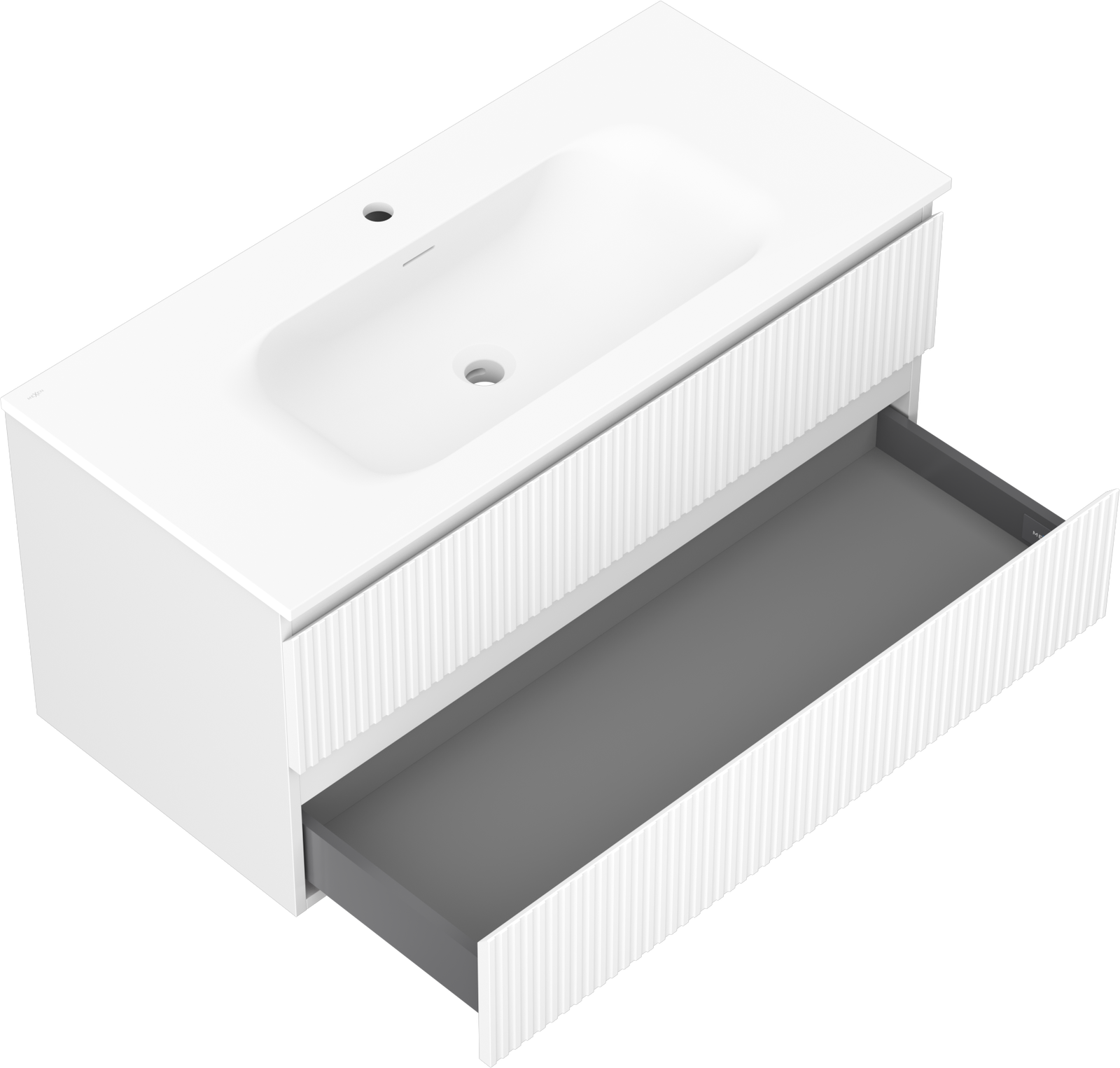 Decupajul în sertar este proiectat în așa fel încât să acomodeze sifonul, care este esențial în instalațiile de lavoare. Datorită acestui fapt, mobila poate fi montată complet funcțională, fără a fi necesară renunțarea la spațiul din sertar în favoarea instalației.