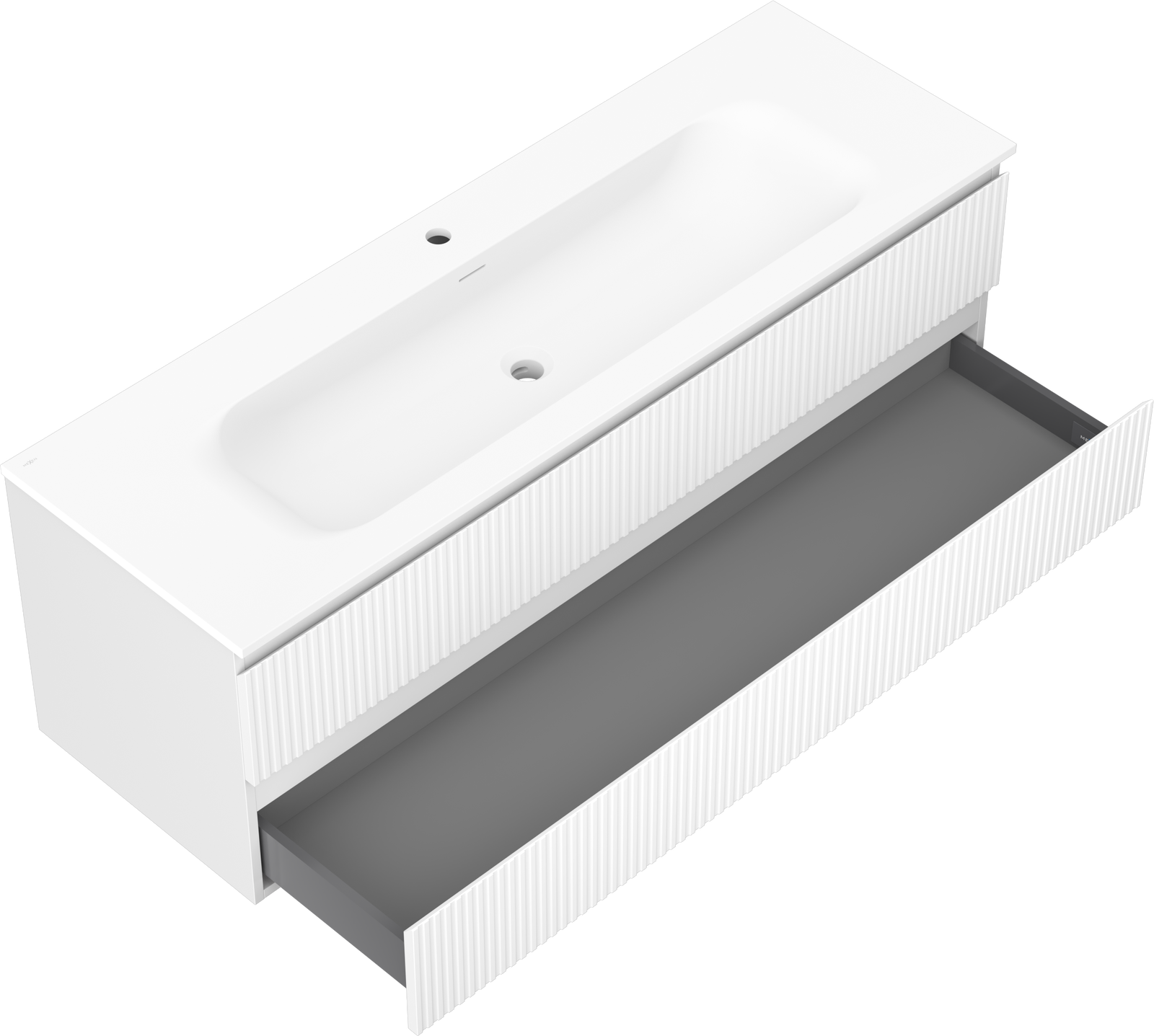 Decupajul în sertar este proiectat în așa fel încât să acomodeze sifonul, care este esențial în instalațiile de lavoare. Datorită acestui fapt, mobila poate fi montată complet funcțională, fără a fi necesară renunțarea la spațiul din sertar în favoarea instalației.