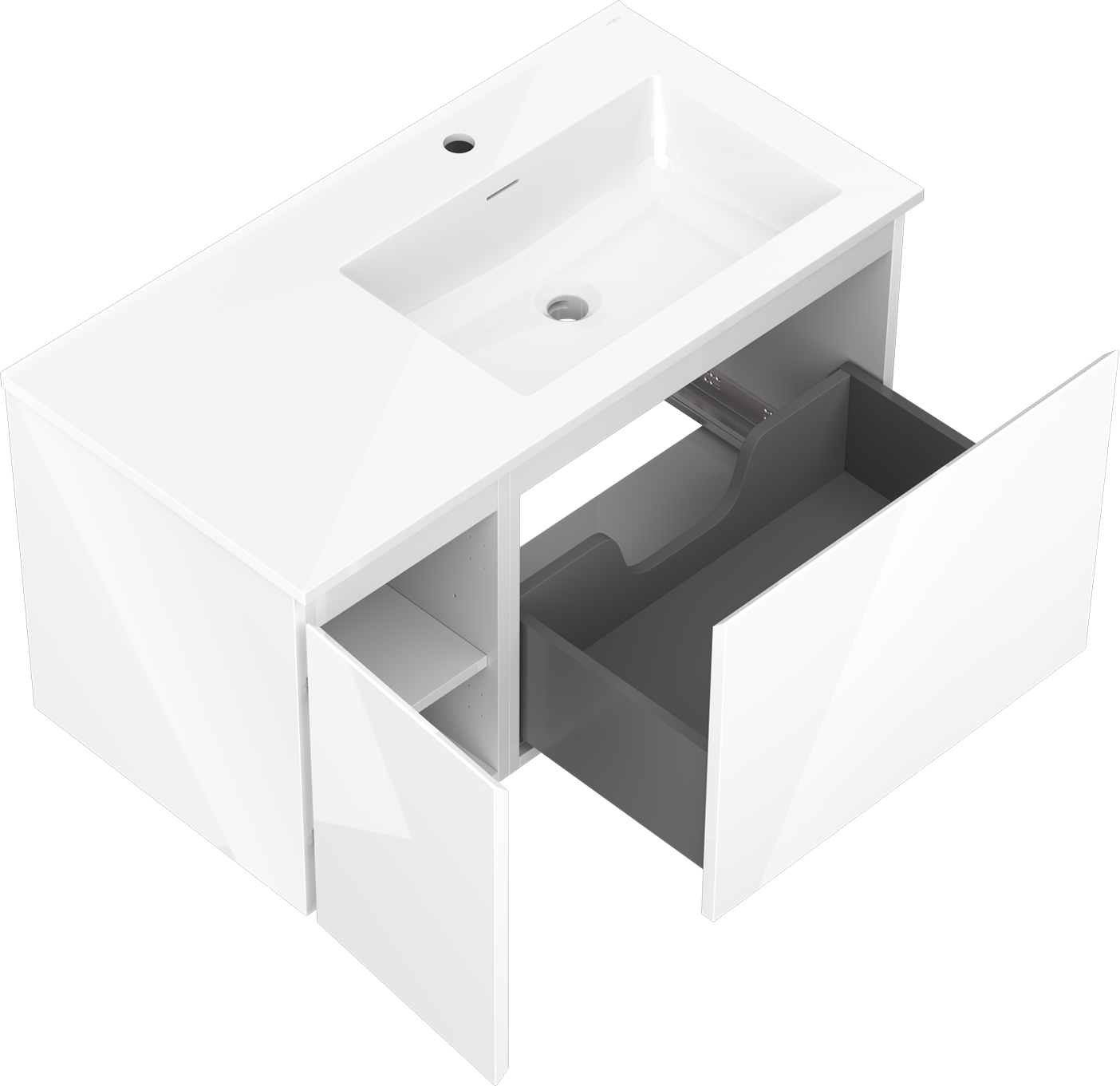 Decupajul în sertar este proiectat în așa fel încât să acomodeze sifonul, care este esențial în instalațiile de lavoare. Datorită acestui fapt, mobila poate fi montată complet funcțională, fără a fi necesară renunțarea la spațiul din sertar în favoarea instalației.