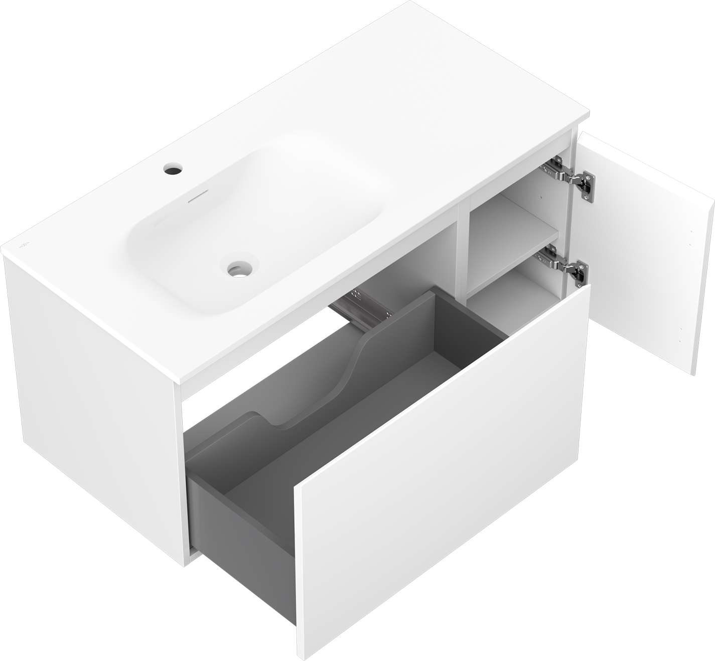 Decupajul în sertar este proiectat în așa fel încât să acomodeze sifonul, care este esențial în instalațiile de lavoare. Datorită acestui fapt, mobila poate fi montată complet funcțională, fără a fi necesară renunțarea la spațiul din sertar în favoarea instalației.