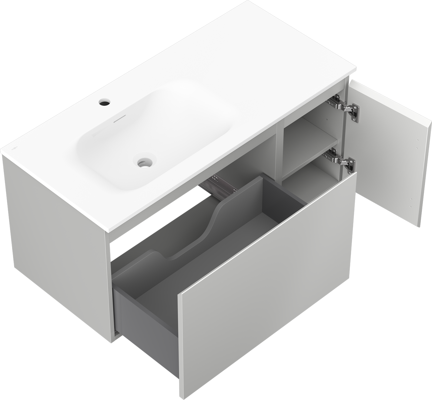 Decupajul în sertar este proiectat în așa fel încât să acomodeze sifonul, care este esențial în instalațiile de lavoare. Datorită acestui fapt, mobila poate fi montată complet funcțională, fără a fi necesară renunțarea la spațiul din sertar în favoarea instalației.