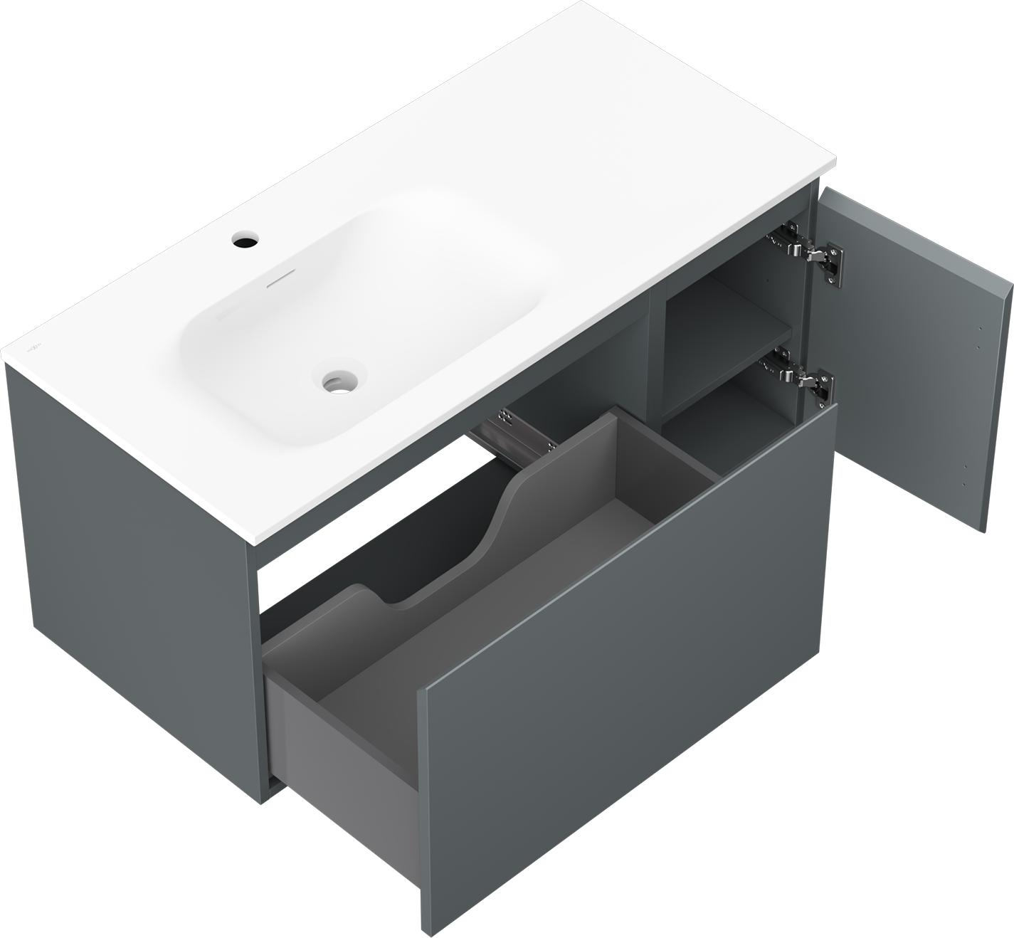 Decupajul în sertar este proiectat în așa fel încât să acomodeze sifonul, care este esențial în instalațiile de lavoare. Datorită acestui fapt, mobila poate fi montată complet funcțională, fără a fi necesară renunțarea la spațiul din sertar în favoarea instalației.