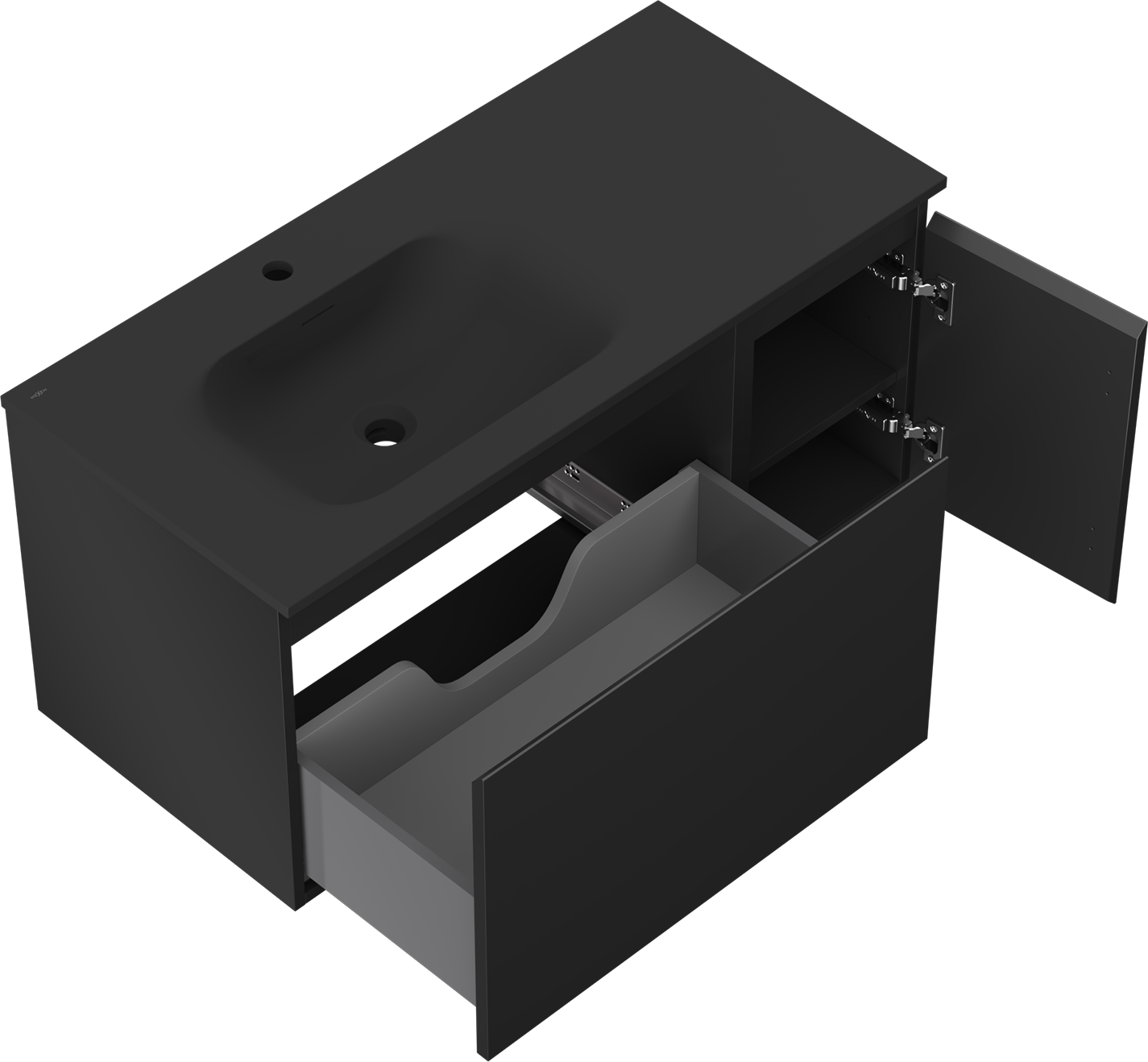 Decupajul în sertar este proiectat în așa fel încât să acomodeze sifonul, care este esențial în instalațiile de lavoare. Datorită acestui fapt, mobila poate fi montată complet funcțională, fără a fi necesară renunțarea la spațiul din sertar în favoarea instalației.