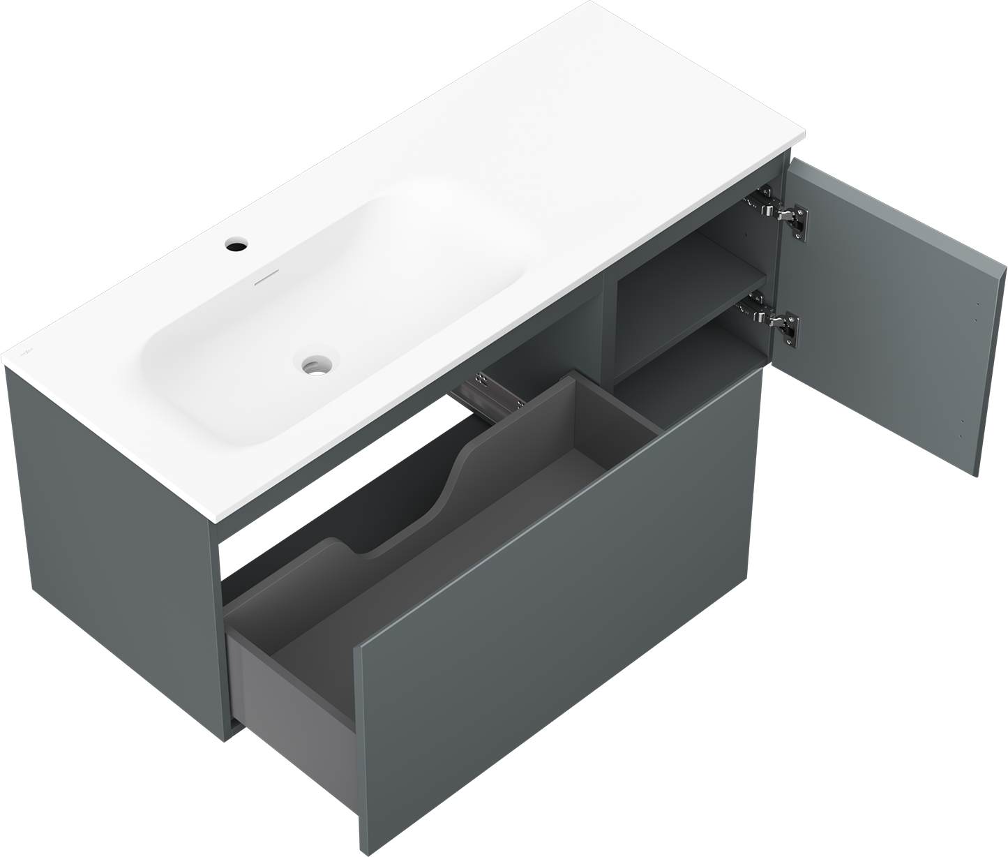 Decupajul în sertar este proiectat în așa fel încât să acomodeze sifonul, care este esențial în instalațiile de lavoare. Datorită acestui fapt, mobila poate fi montată complet funcțională, fără a fi necesară renunțarea la spațiul din sertar în favoarea instalației.