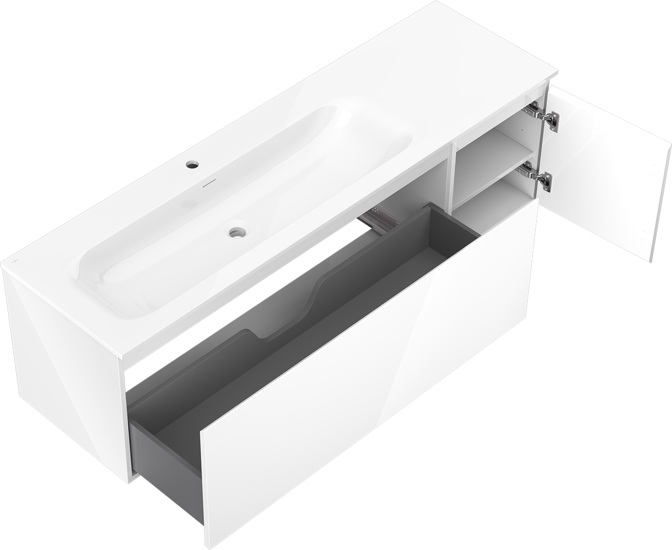 Decupajul în sertar este proiectat în așa fel încât să acomodeze sifonul, care este esențial în instalațiile de lavoare. Datorită acestui fapt, mobila poate fi montată complet funcțională, fără a fi necesară renunțarea la spațiul din sertar în favoarea instalației.