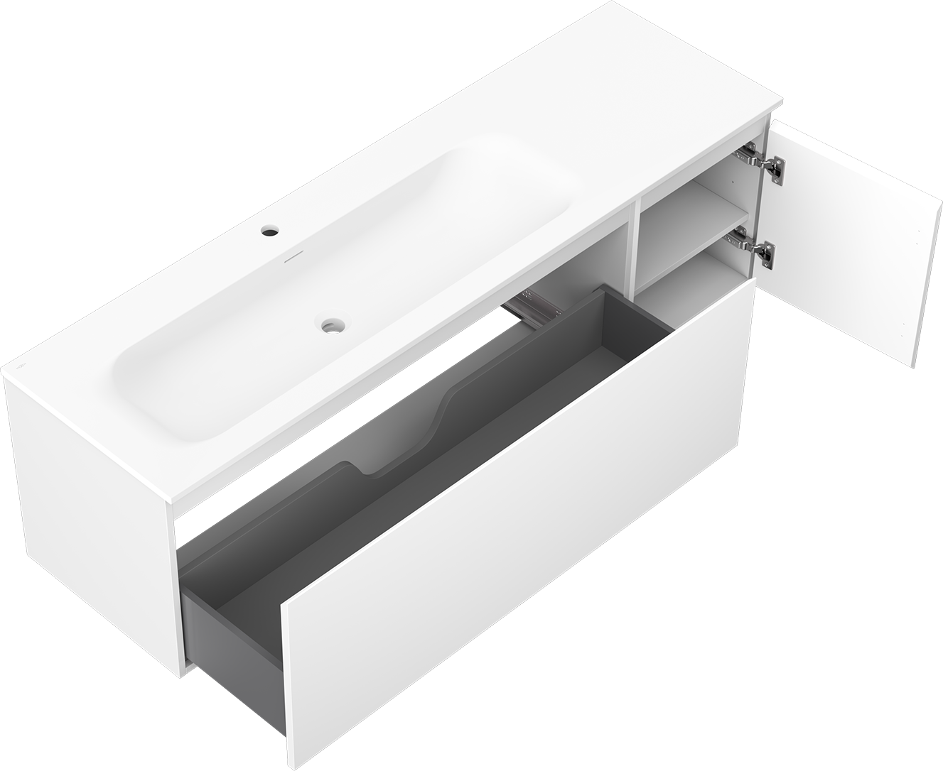 Decupajul în sertar este proiectat în așa fel încât să acomodeze sifonul, care este esențial în instalațiile de lavoare. Datorită acestui fapt, mobila poate fi montată complet funcțională, fără a fi necesară renunțarea la spațiul din sertar în favoarea instalației.