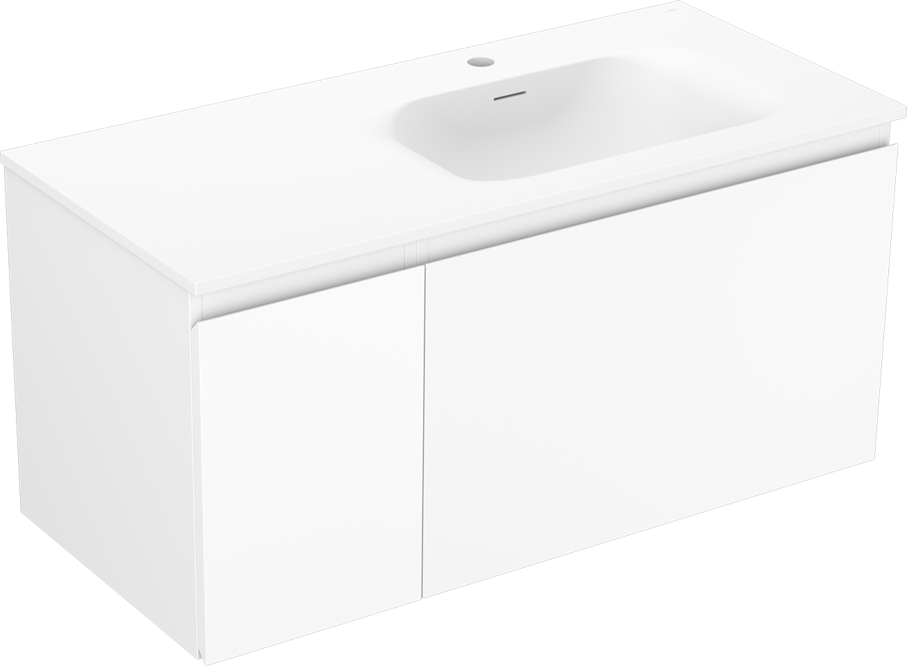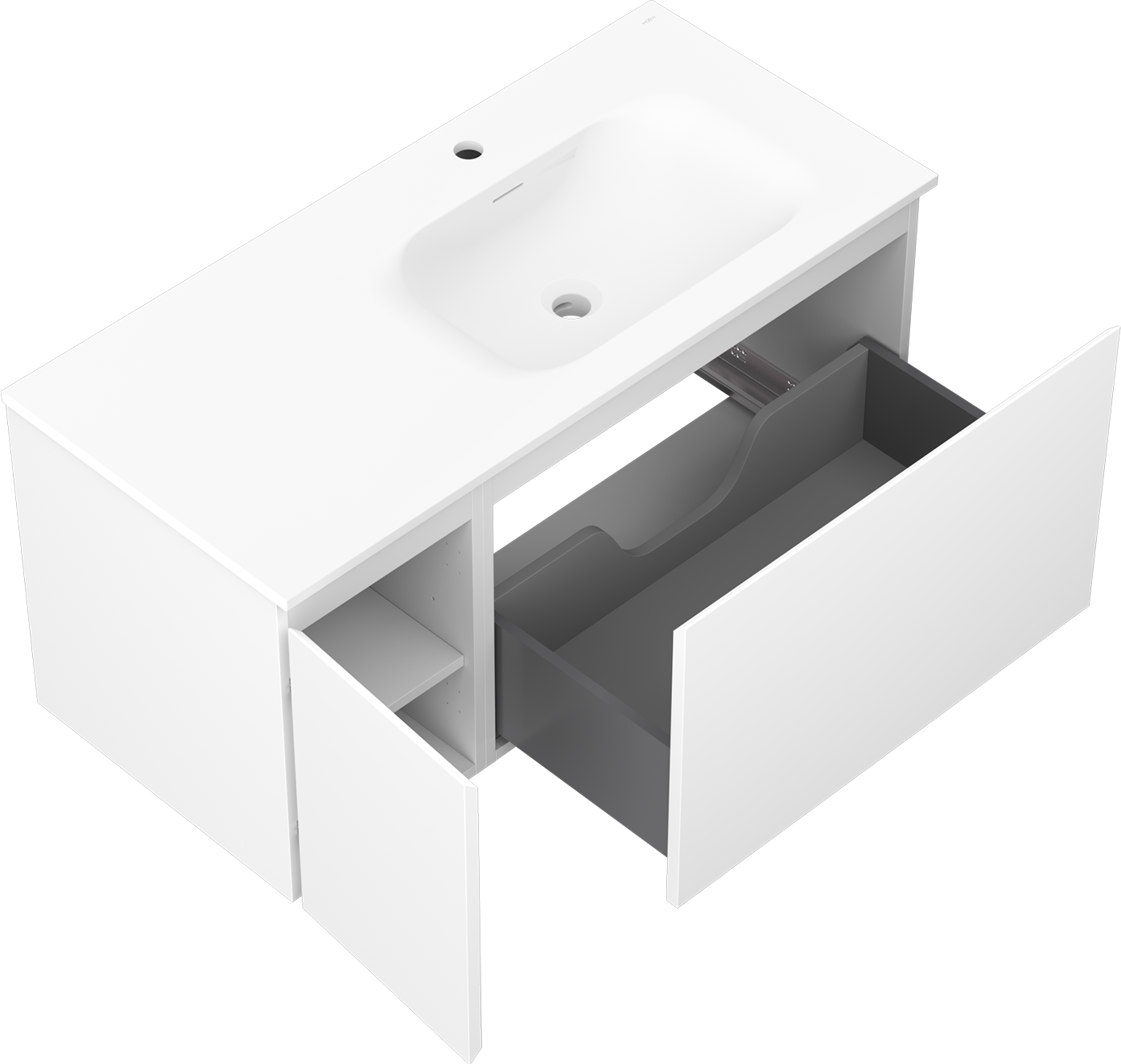Decupajul în sertar este proiectat în așa fel încât să acomodeze sifonul, care este esențial în instalațiile de lavoare. Datorită acestui fapt, mobila poate fi montată complet funcțională, fără a fi necesară renunțarea la spațiul din sertar în favoarea instalației.