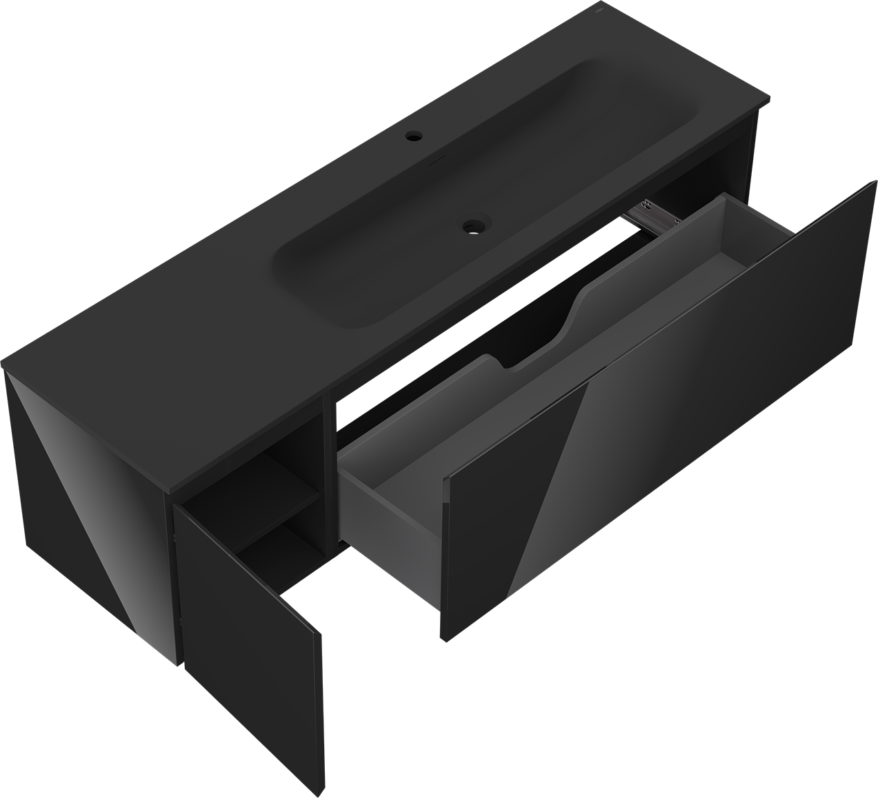 Decupajul în sertar este proiectat în așa fel încât să acomodeze sifonul, care este esențial în instalațiile de lavoare. Datorită acestui fapt, mobila poate fi montată complet funcțională, fără a fi necesară renunțarea la spațiul din sertar în favoarea instalației.