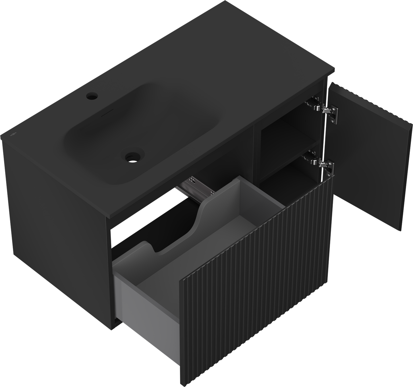 Decupajul în sertar este proiectat în așa fel încât să acomodeze sifonul, care este esențial în instalațiile de lavoare. Datorită acestui fapt, mobila poate fi montată complet funcțională, fără a fi necesară renunțarea la spațiul din sertar în favoarea instalației.