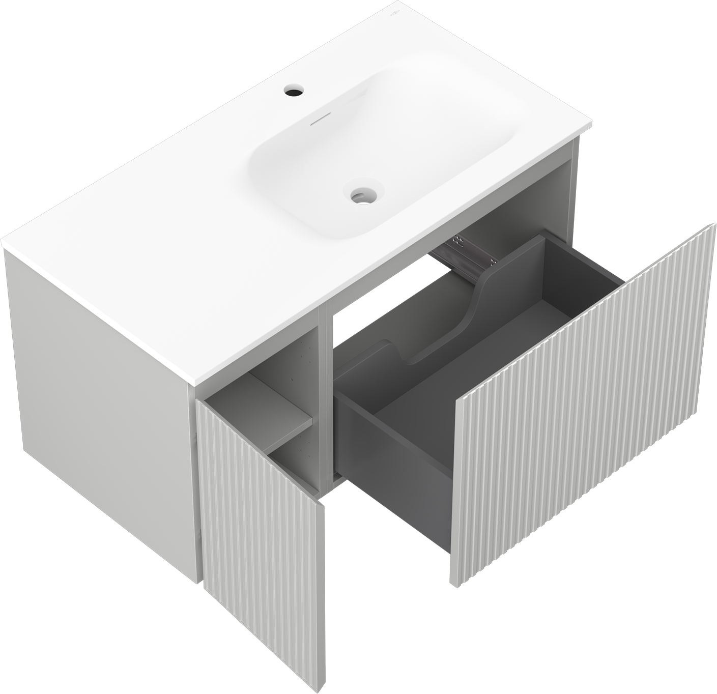Decupajul în sertar este proiectat în așa fel încât să acomodeze sifonul, care este esențial în instalațiile de lavoare. Datorită acestui fapt, mobila poate fi montată complet funcțională, fără a fi necesară renunțarea la spațiul din sertar în favoarea instalației.