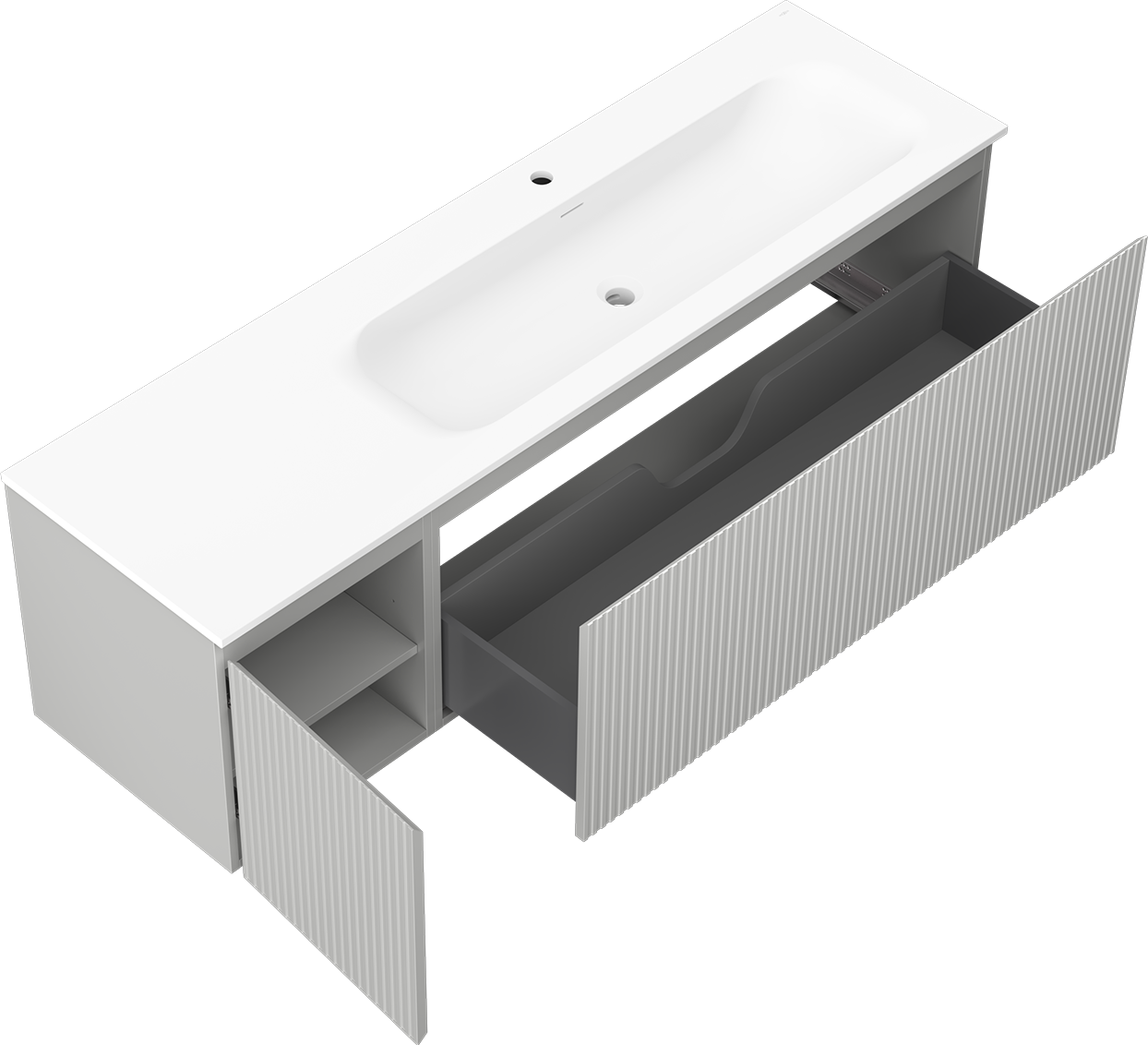 Decupajul în sertar este proiectat în așa fel încât să acomodeze sifonul, care este esențial în instalațiile de lavoare. Datorită acestui fapt, mobila poate fi montată complet funcțională, fără a fi necesară renunțarea la spațiul din sertar în favoarea instalației.