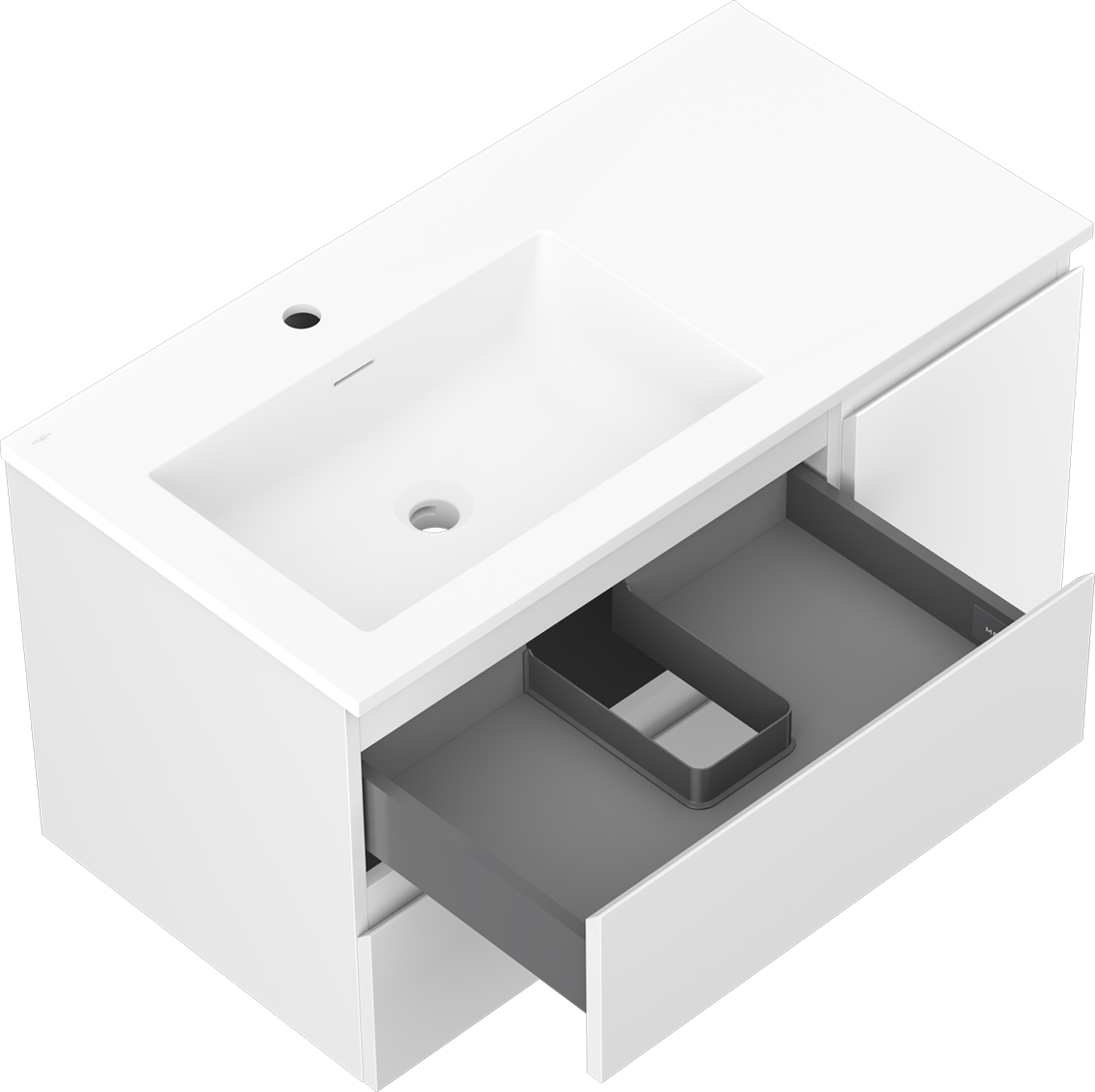 Decupajul în sertar este proiectat în așa fel încât să acomodeze sifonul, care este esențial în instalațiile de lavoare. Datorită acestui fapt, mobila poate fi montată complet funcțională, fără a fi necesară renunțarea la spațiul din sertar în favoarea instalației.