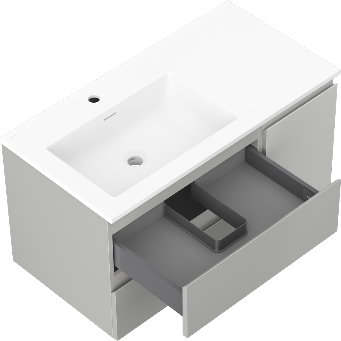 Decupajul în sertar este proiectat în așa fel încât să acomodeze sifonul, care este esențial în instalațiile de lavoare. Datorită acestui fapt, mobila poate fi montată complet funcțională, fără a fi necesară renunțarea la spațiul din sertar în favoarea instalației.