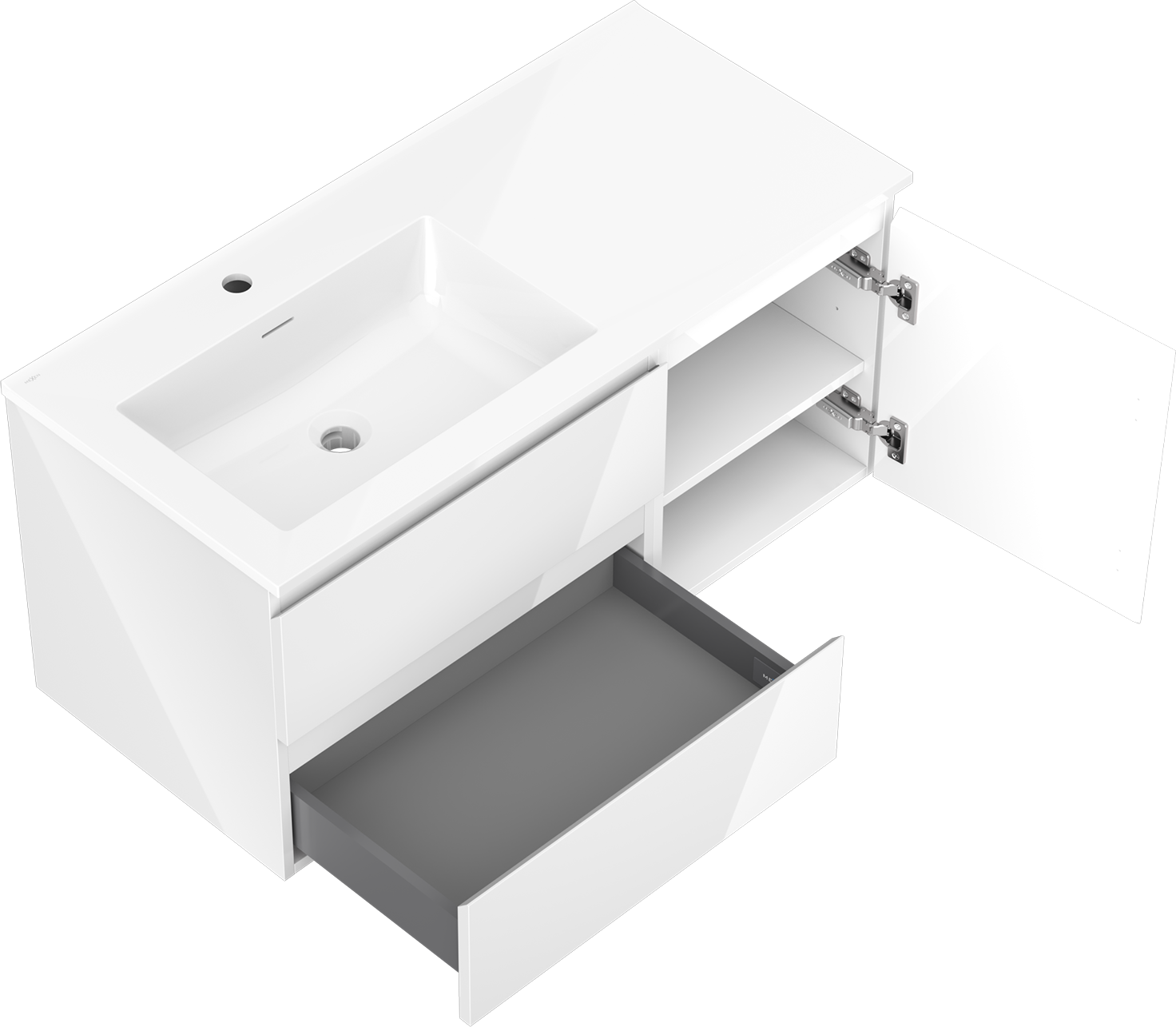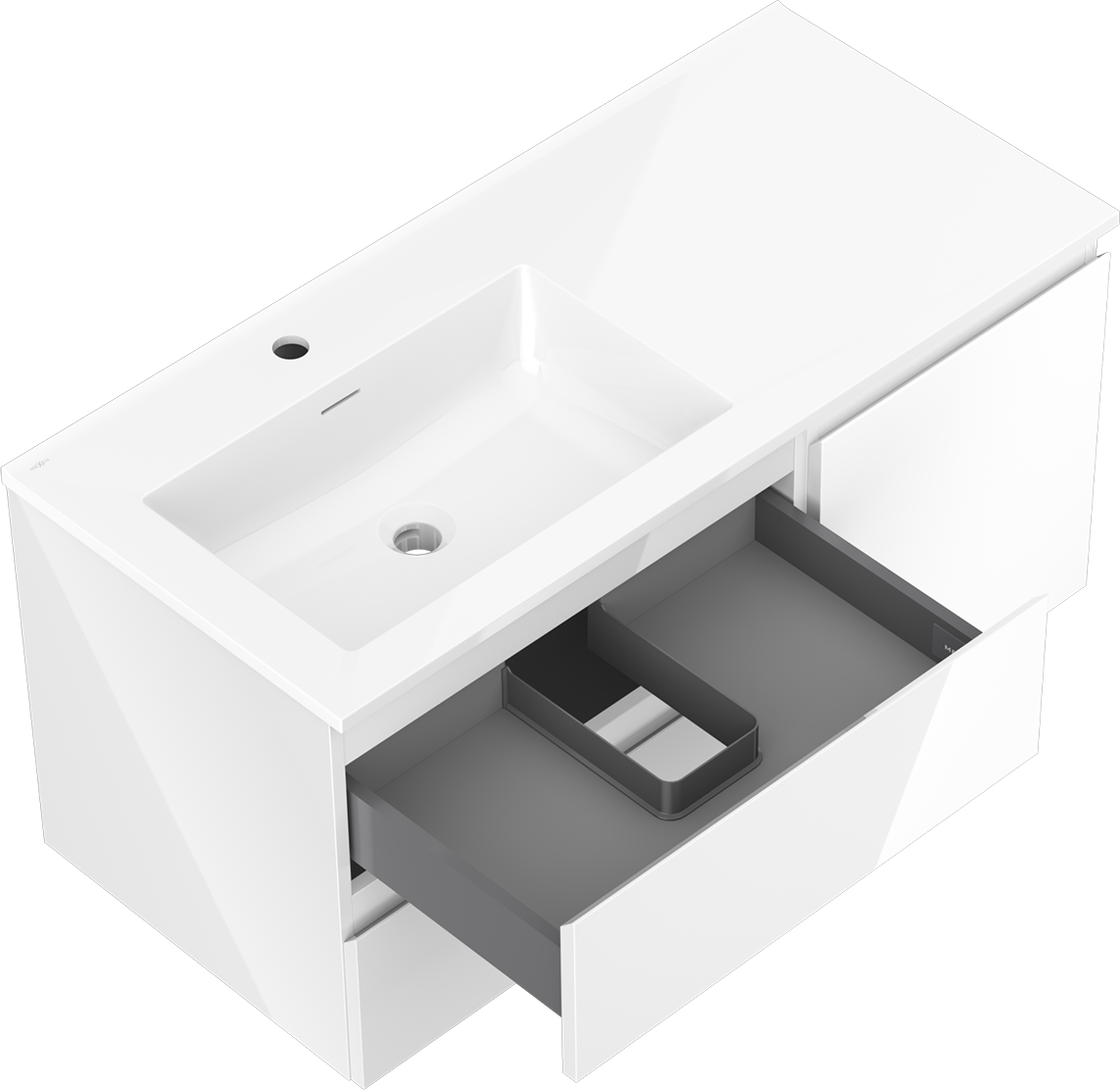 Decupajul în sertar este proiectat în așa fel încât să acomodeze sifonul, care este esențial în instalațiile de lavoare. Datorită acestui fapt, mobila poate fi montată complet funcțională, fără a fi necesară renunțarea la spațiul din sertar în favoarea instalației.