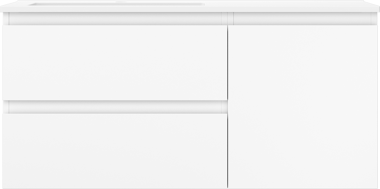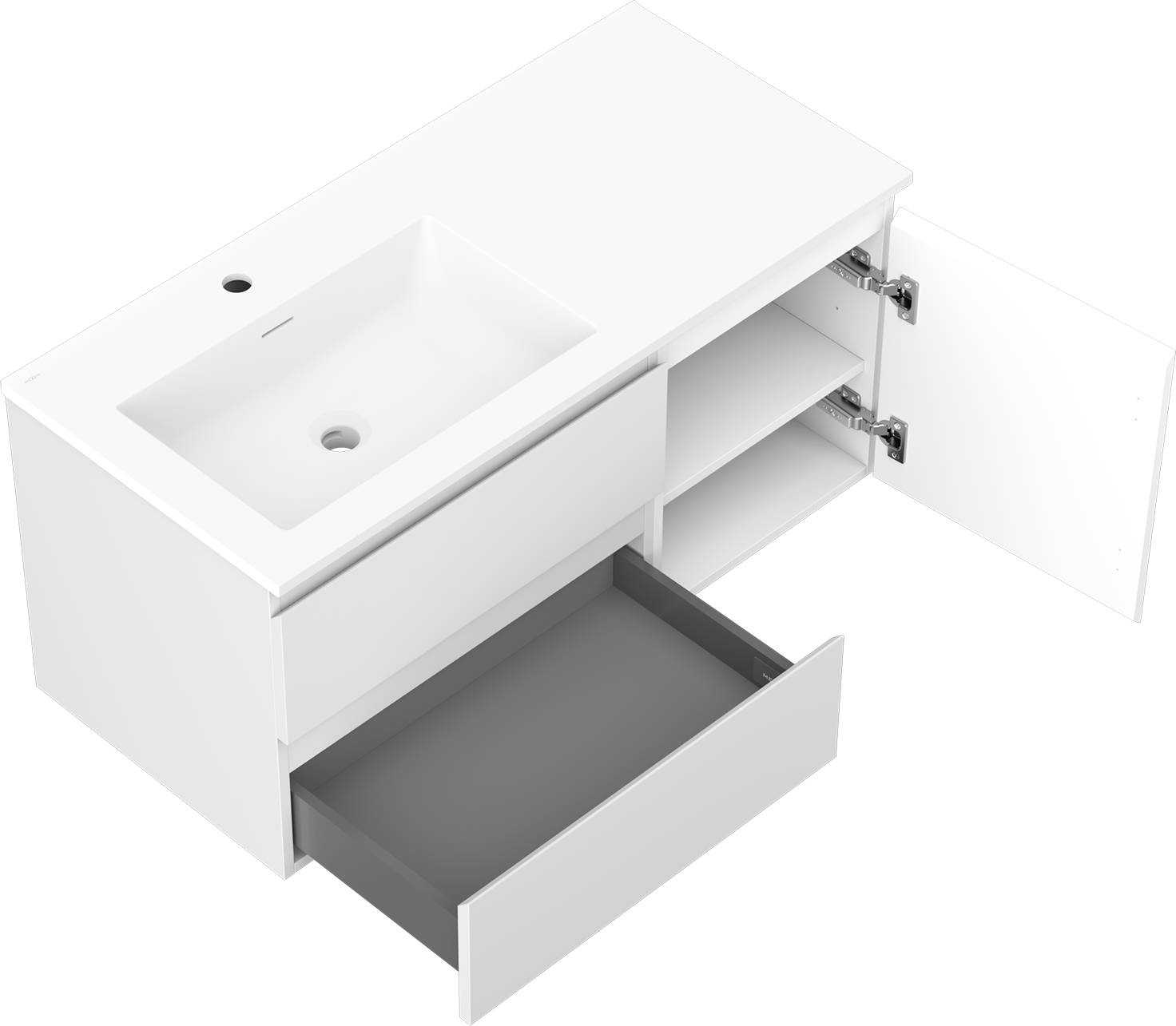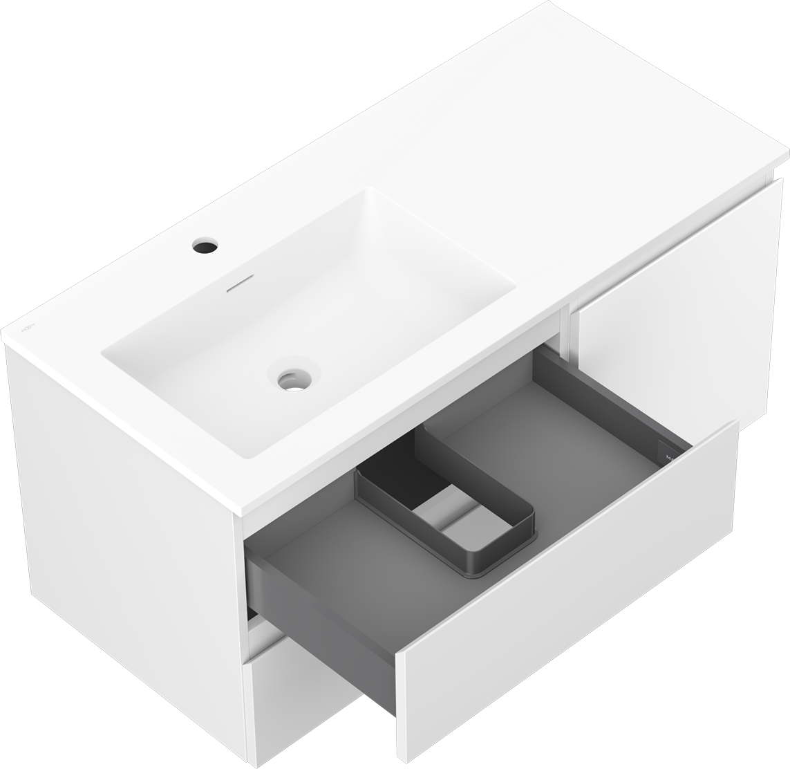 Decupajul în sertar este proiectat în așa fel încât să acomodeze sifonul, care este esențial în instalațiile de lavoare. Datorită acestui fapt, mobila poate fi montată complet funcțională, fără a fi necesară renunțarea la spațiul din sertar în favoarea instalației.