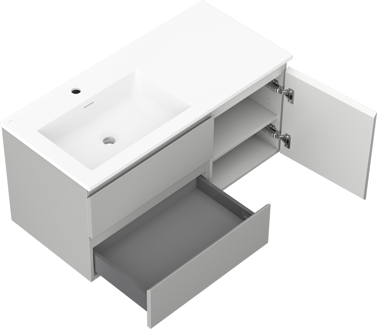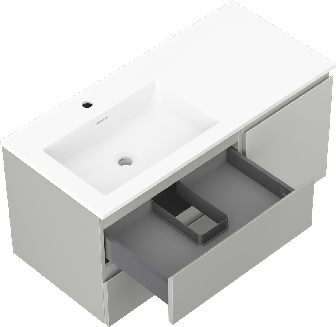 Decupajul în sertar este proiectat în așa fel încât să acomodeze sifonul, care este esențial în instalațiile de lavoare. Datorită acestui fapt, mobila poate fi montată complet funcțională, fără a fi necesară renunțarea la spațiul din sertar în favoarea instalației.