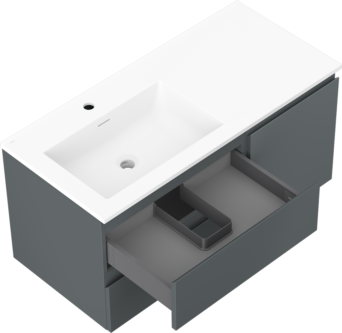 Decupajul în sertar este proiectat în așa fel încât să acomodeze sifonul, care este esențial în instalațiile de lavoare. Datorită acestui fapt, mobila poate fi montată complet funcțională, fără a fi necesară renunțarea la spațiul din sertar în favoarea instalației.