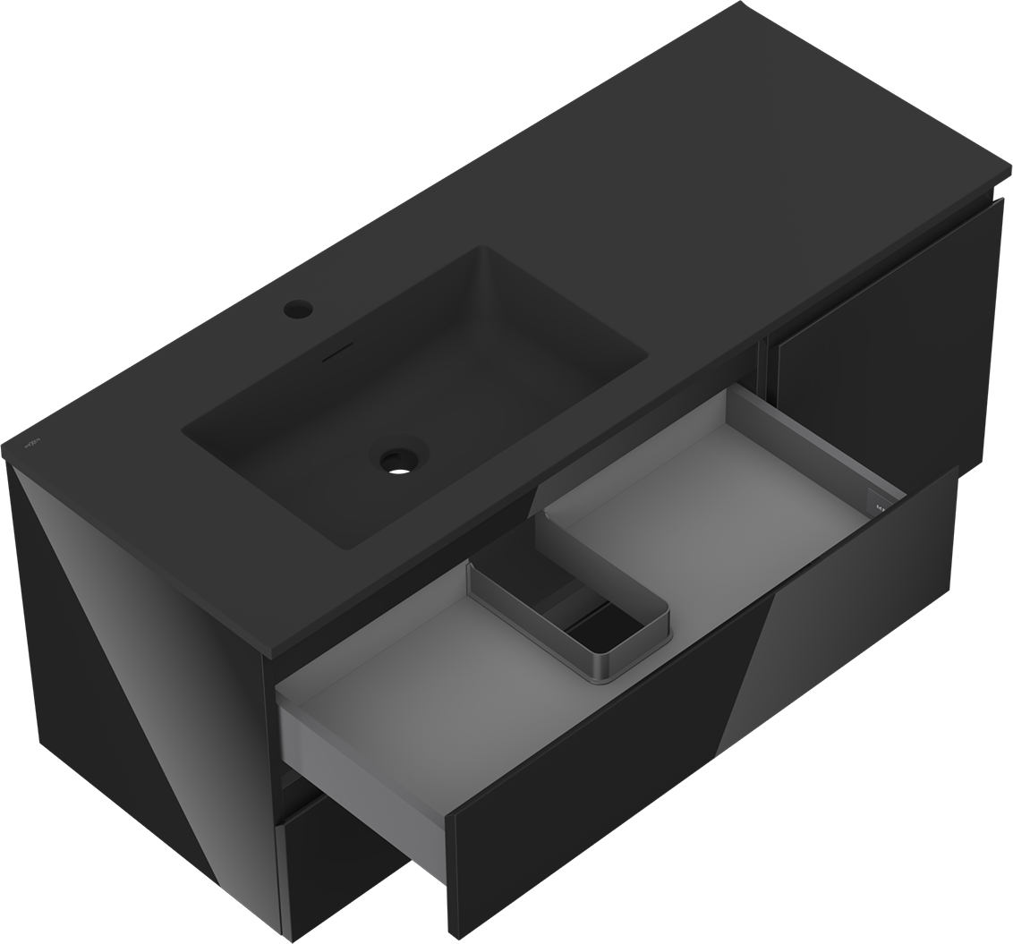Decupajul în sertar este proiectat în așa fel încât să acomodeze sifonul, care este esențial în instalațiile de lavoare. Datorită acestui fapt, mobila poate fi montată complet funcțională, fără a fi necesară renunțarea la spațiul din sertar în favoarea instalației.